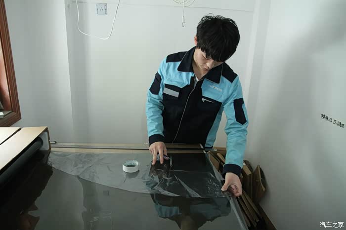 洗车的时候,裁剪贴膜的工序就在另一边同时展开了