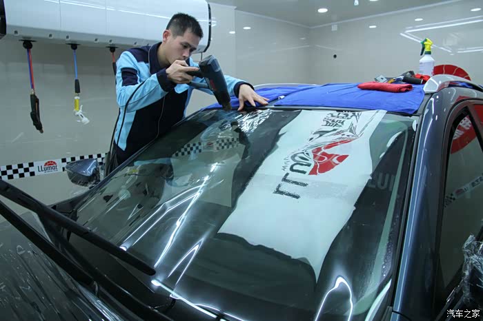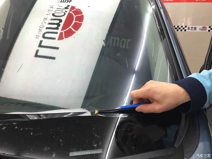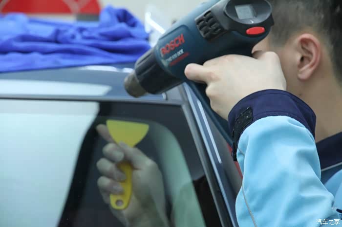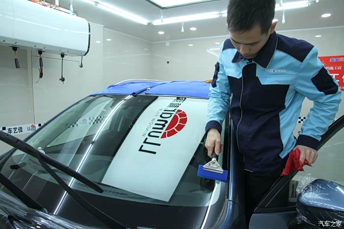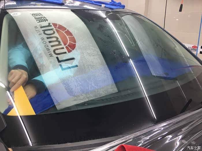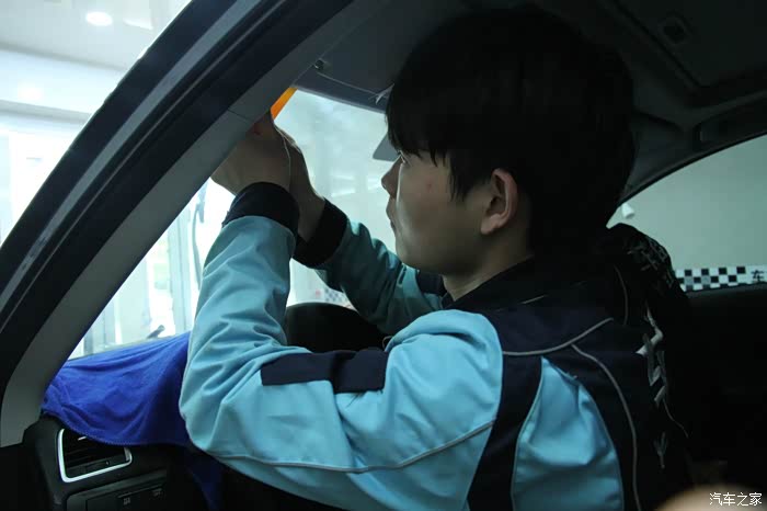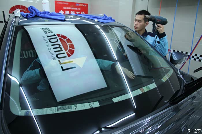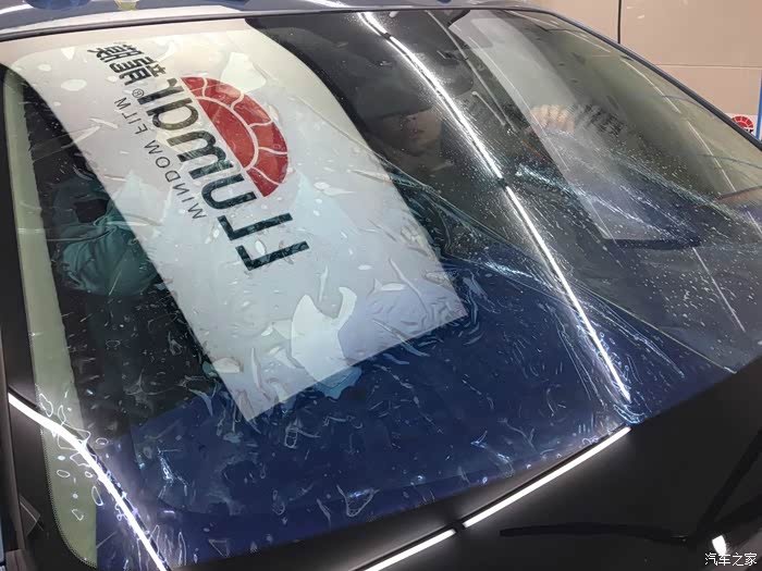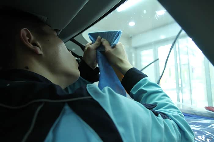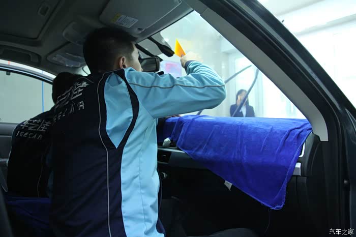 精裁之后就开始贴膜了,先把毛巾塞进前挡和中控台的缝隙中,防止贴膜上的水被刮进中控台内,然后和贴侧窗一样把膜附上去用刮板把水刮掉,细节处有必要时还要用烤枪加热