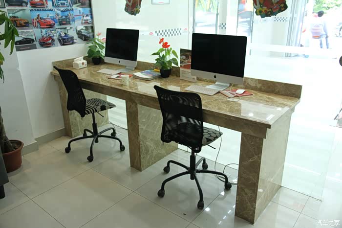 店堂内休息区,顾客用电脑是水果机哦,一侧还有龙膜的隔热效果体验区,墙面上有一些施工效果图和产品对比说明