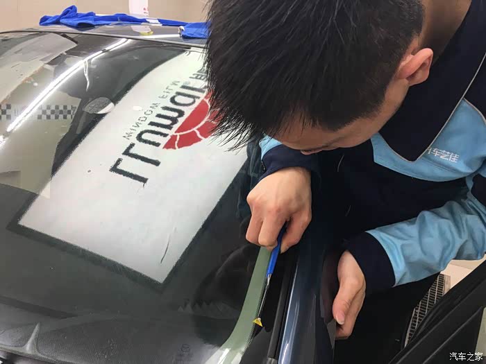 前挡膜烤膜的同时,两个侧前挡也在施工中,贴膜位置稍加比对进行精裁,裁剪出合适车窗大小的贴膜~