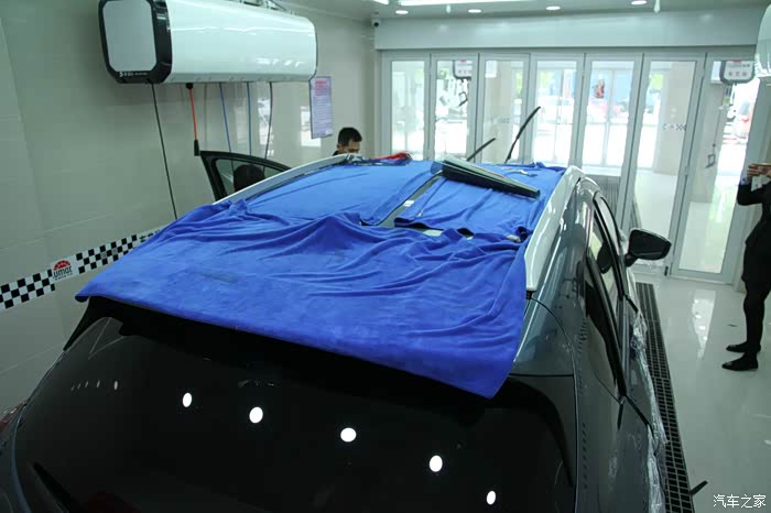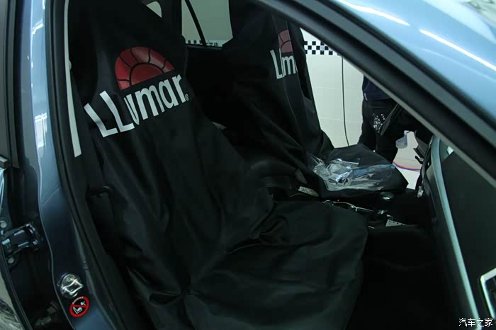 再回到工位上,车子已经洗完了,在车身上围上保护膜,为防止施工时损坏车漆,在座位和方向盘上套上保护套,防止弄脏内饰,在车顶上铺上大毛巾,防止工具损伤车顶的车漆,此处细节给大赞~