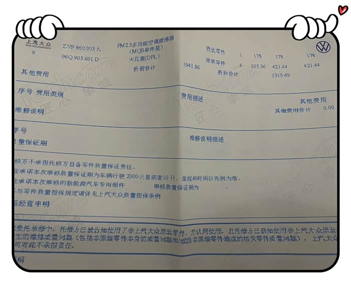 小帕已经开了四万公里了,之前在两万公里做保养的时候换过一次火花塞,按照大众的保养说明书,每两万公里需要更换火花塞,于是提前联系好4S店将火花塞更换了。