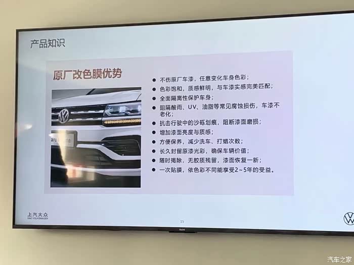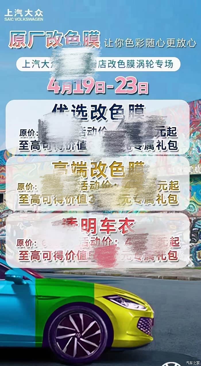 前段时间去4s店保养的时候,看到他们的改色膜广告,才知道上汽大众现在有自己品牌的改色膜。于是就找售后顾问了解了一下这个是厂家刚上的一个项目现在正在做促销活动,价格实惠随后就跟我讲大众原厂的改色膜是由国内排行靠前的纳尔股份代工生产的。听了销售这么一说。感觉毕竟是厂家出的产品。质量肯定比外面的要好很多,刚好赶上现在做促销活动。价格也比较实惠。最后算下来高端膜是4980还送了保养券和其他的用车权益。总体算下来和外边的价格差不多,主要是买个厂家的售后和5年的质保。