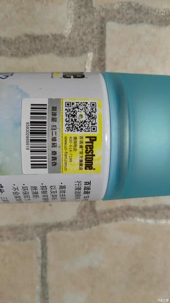 百适通车内空气净化剂罐体上百适通官方旗舰店二维码,防伪条形码和400防伪电话实拍
