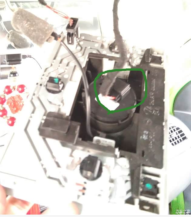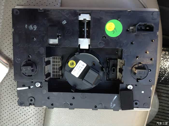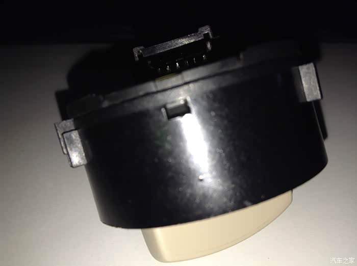 从今年七月份开始发现天窗经常会自动开启,刚开始时只要手动开关一次可以暂时可以控制,但随着时间推移出现了完全不受控制了,只能通过遥控关窗了。在网上查了一下其他车型也有类似的都天窗开关的问题,我分析了一下也应该是开关的问题居多了(原因:可以遥控关窗,证明电机及控制线路是正常的)。上网查开关要100多RMB,是我一周上班的油费,太贵了还是自己想想办法是否能处理好。本人本来是学电子的,估计开关应该是碳膜电位器一类的开关,此类开关多数是碳膜或弹片出了问题。不说废话动手开拆,工具一普通的一字批。四个角有卡扣拆两个接头,两个接已有防呆功能,不会插反不需标记。成功拿下中心位置圆形就天窗开关,是由上面三个卡扣扣...