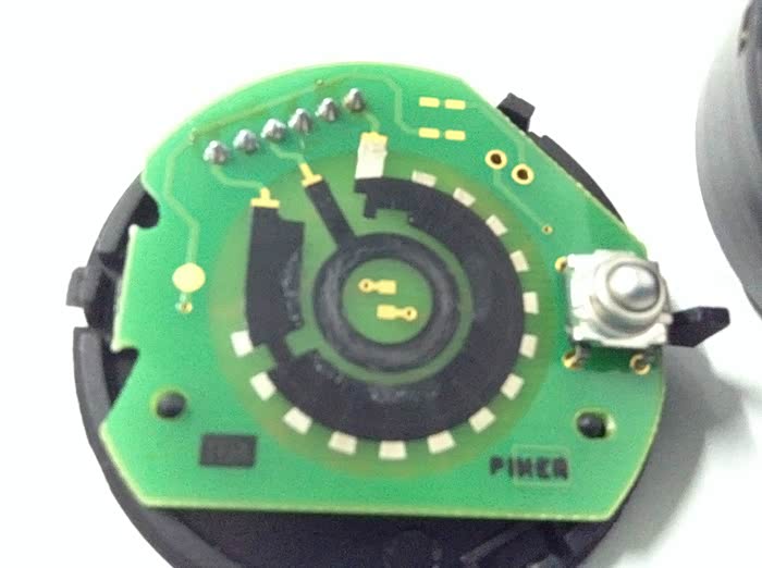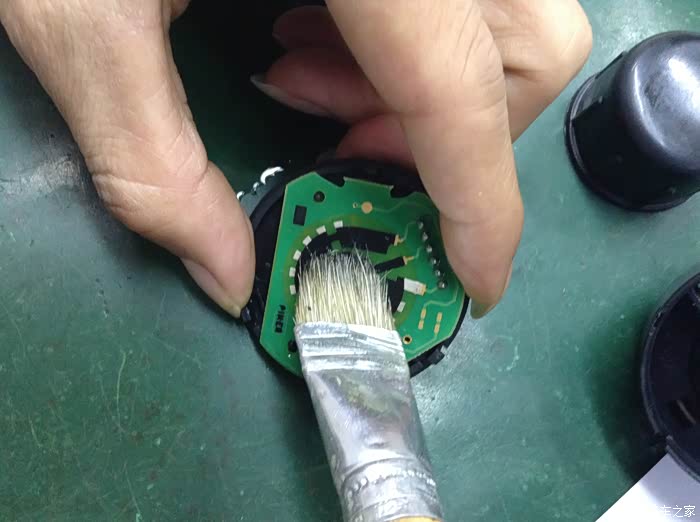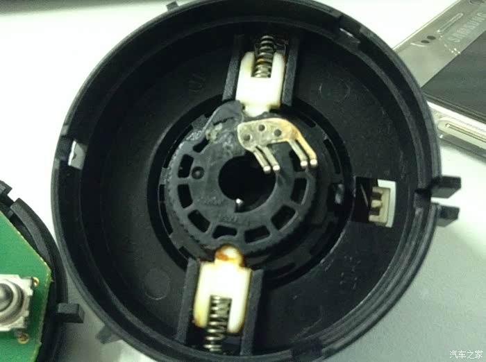 四:这里划个重点:也是问题所在的二个方面:一是如人所说的脏,其实这里还是蛮干净的,至少我的是干净的;二才是重点——小弹簧片固定松动,可以看楼主的照片,是三个小孔固定的,时间一久松动了,我没有楼主的设备来另外加工一个镙丝,用了哥俩好的胶水,酒精清洗一下底座,调了一点粘上,等了差不多十分钟看样子固定住了就装回,顺便说一下,酒精清洗线路板及小弹簧片后最好用WD40喷一下,附带把哪个圆形的小开关也喷一下,用了WD40后小弹簧片明显发亮。