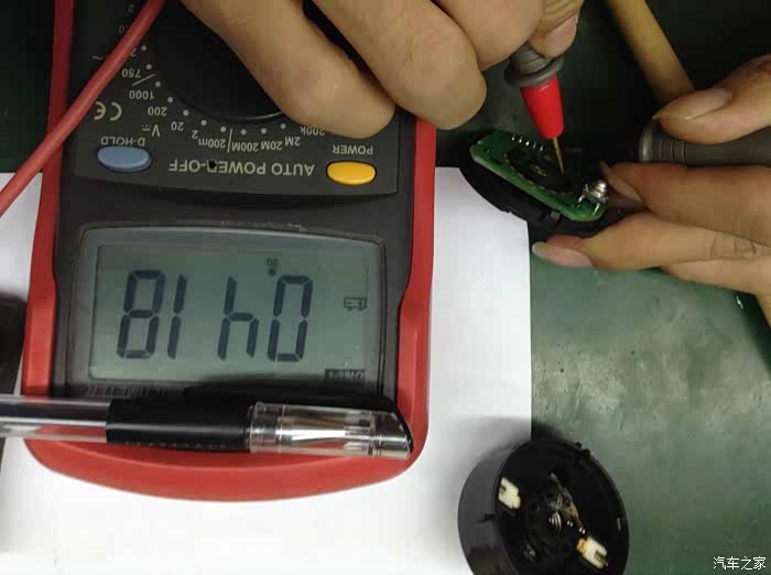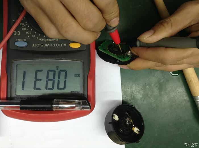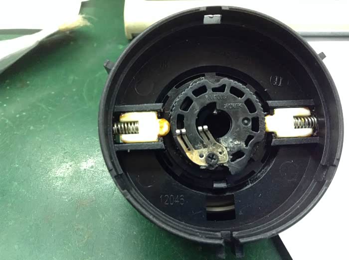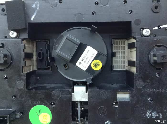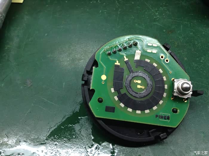 从今年七月份开始发现天窗经常会自动开启,刚开始时只要手动开关一次可以暂时可以控制,但随着时间推移出现了完全不受控制了,只能通过遥控关窗了。在网上查了一下其他车型也有类似的都天窗开关的问题,我分析了一下也应该是开关的问题居多了(原因:可以遥控关窗,证明电机及控制线路是正常的)。上网查开关要100多RMB,是我一周上班的油费,太贵了还是自己想想办法是否能处理好。本人本来是学电子的,估计开关应该是碳膜电位器一类的开关,此类开关多数是碳膜或弹片出了问题。不说废话动手开拆,工具一普通的一字批。四个角有卡扣拆两个接头,两个接已有防呆功能,不会插反不需标记。成功拿下中心位置圆形就天窗开...
