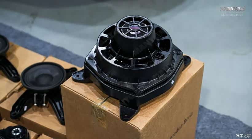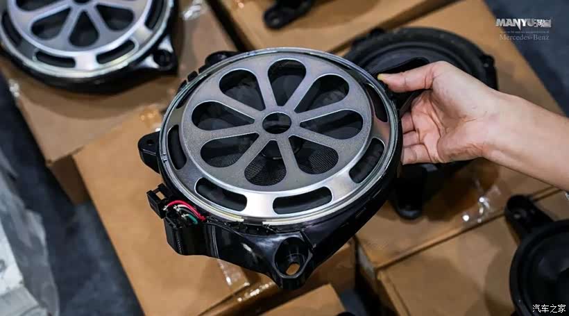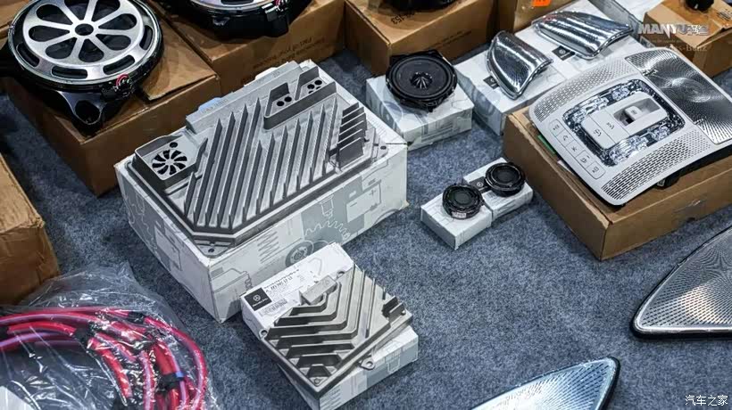 ▲ 原厂全套大柏林配件:25个扬声器,大小功放,原厂线束,原厂A柱发光喇叭罩一对,原厂顶棚柏林2个,原厂阅读灯总成,副厂四门低音喇叭罩。