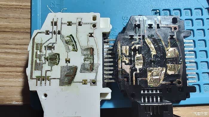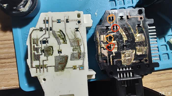 拆开拨杆,主要是触点最左边涉及到大灯开关,原车是3个档,但自动大灯是4个档,最是通过触点组合实现档位识别的,那理论上改成一样的就可以了。