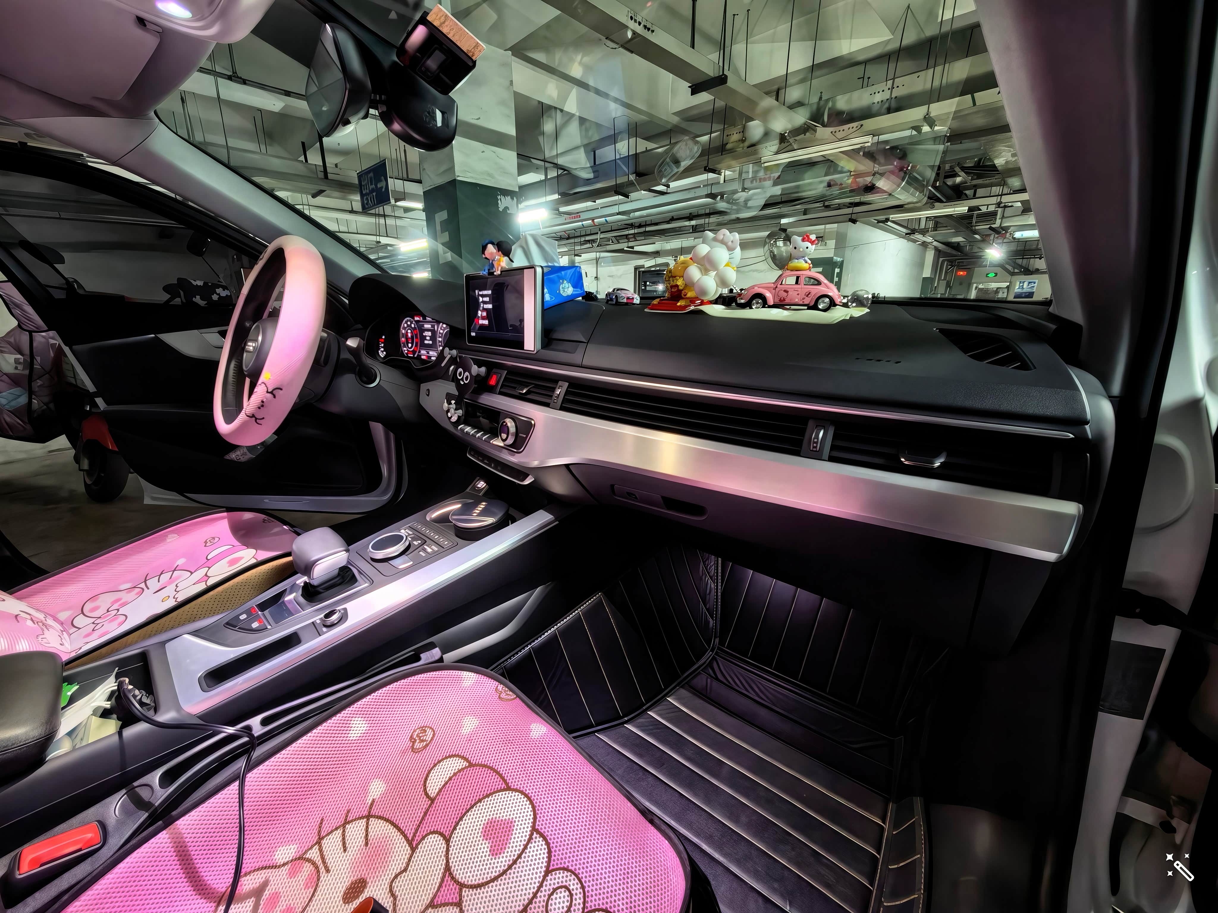 全车从内饰到小装饰,全是老婆的Hello Kitty风格,从方向盘套、座椅垫到车标小贴饰,一应俱全。