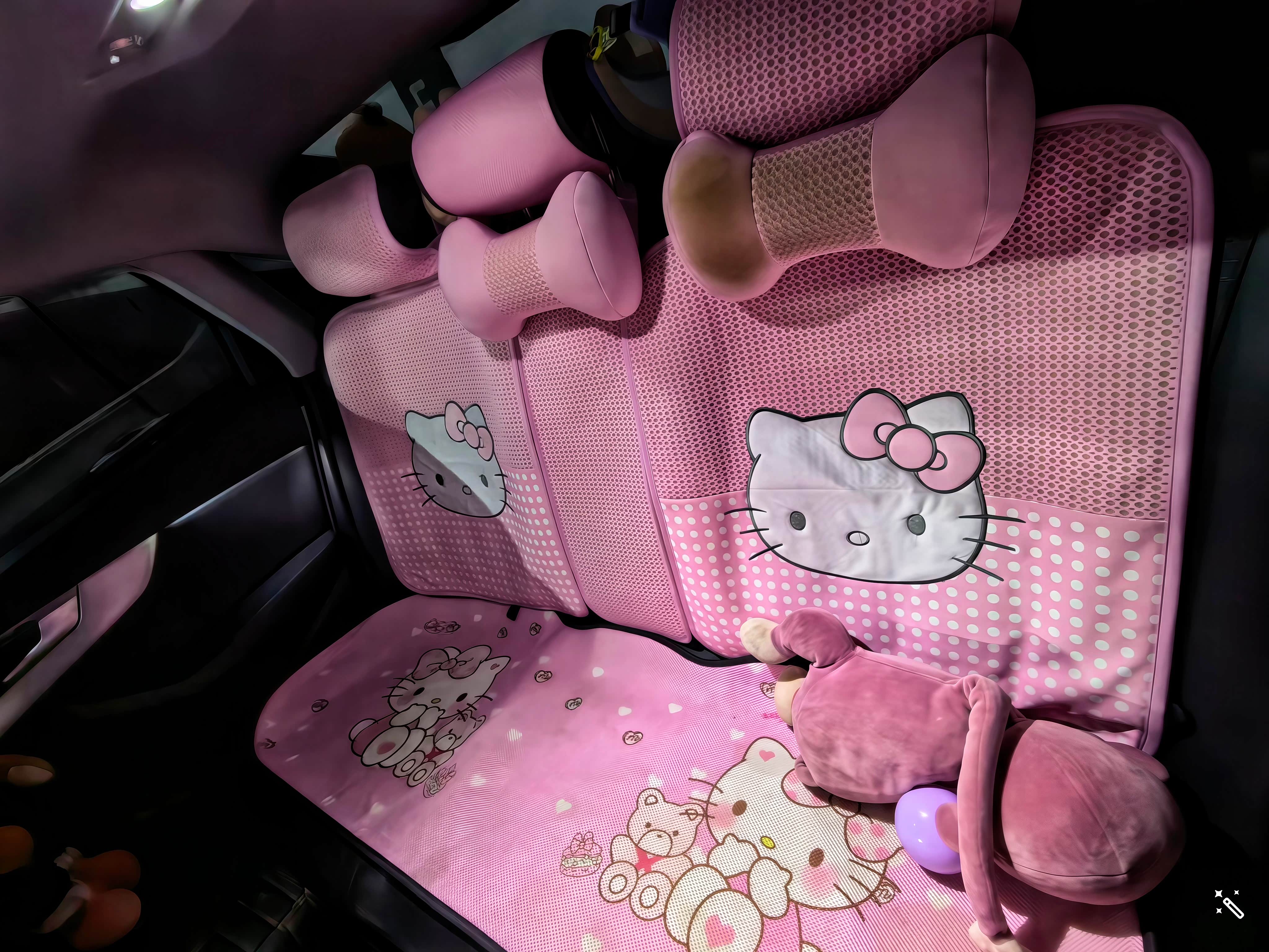 半夜孩子发烧要去医院,老婆慌慌张张启动车,摸着自己买的Hello Kitty方向盘套,座椅加热很快就暖了,那一刻觉得这车不仅是代步工具,更是能给人安心的存在;接孩子放学,孩子一上车就抱着后排的Hello Kitty玩偶,叽叽喳喳跟老婆讲学校的事,小小的车厢里全是烟火气;周末去近郊玩,老婆会把后排铺好卡通座垫,给孩子准备好零食,这车就像一个移动的“小家”,把全家的快乐装在四个轮子上。