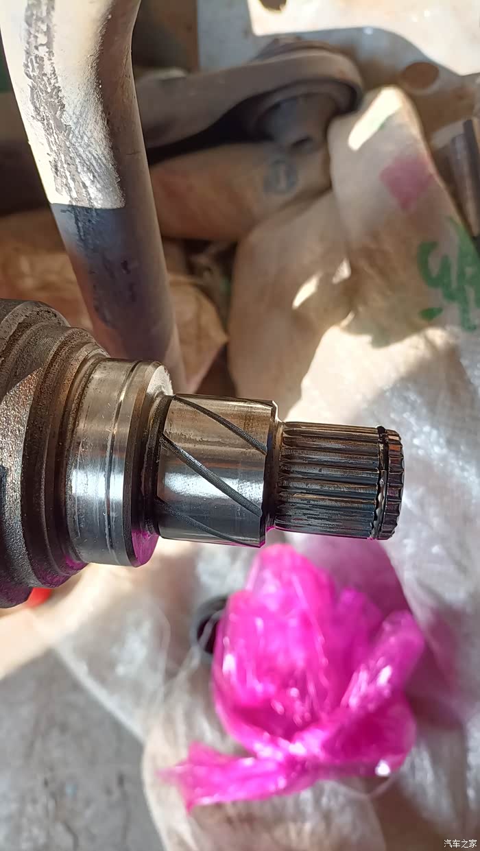 油封位置明显渗油了,其实原因是之前内球笼防尘套破损,由于位置受阻,无法用卡箍紧固防尘套,就用管箍代替,结果造成半轴高速时晃动引发漏油!