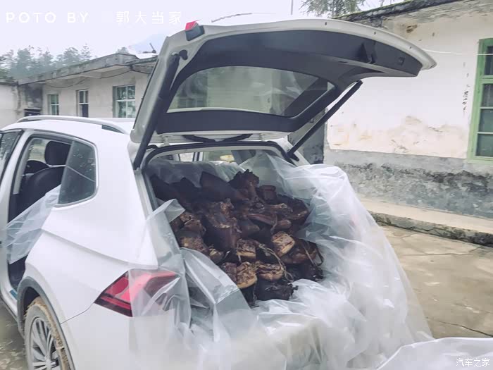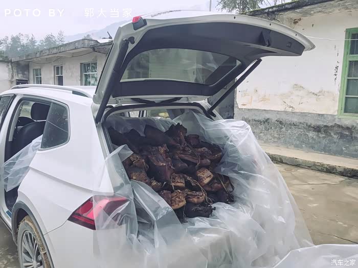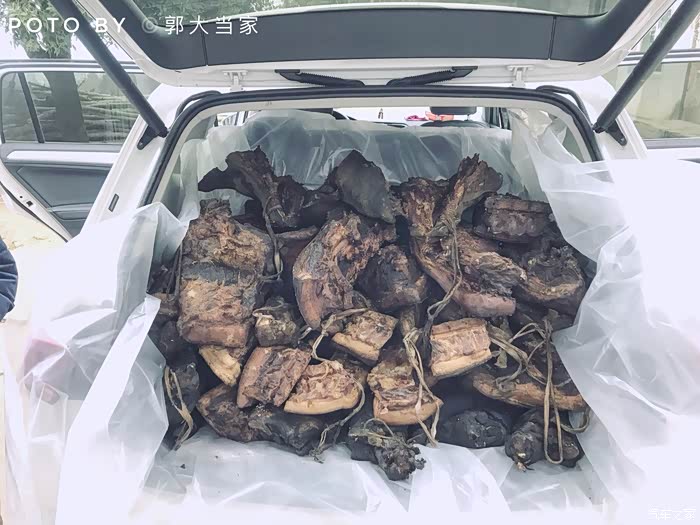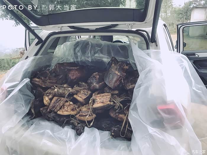大家看到 ,我们家的小途观整个车里面就是我们家一年的腊肉。 这头猪,要让我们吃一年。 后备空间,大家可以清晰看见,拖这么多腊肉,还是妥妥的。 所以途观的空间还真的挺大。拖点什么东西,几乎都能装下。 看了花絮和我们此行的目的以后,就跟着我进入正题吧。