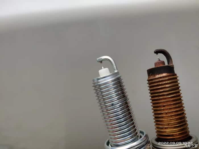 新旧对比。新的是NGK。原车的是电装。状态还很好,再跑几万也问题不大。