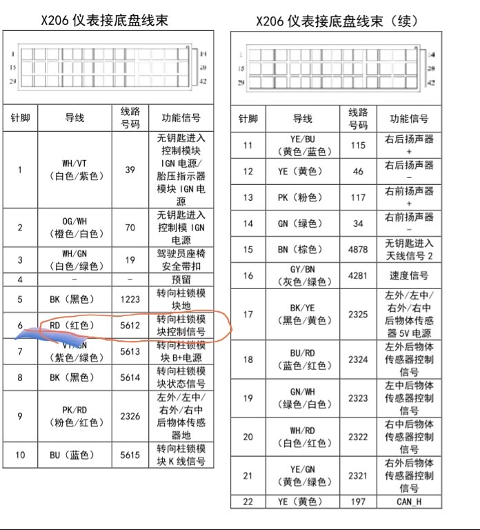 看接插件端线束分布图 X206 仪表接底盘线束 6号针脚(转向柱锁模块控制信号)万用表测量存在线路电阻过高 尝试调紧针脚均无果 线束两端测量阻值不稳定 或者一摇晃线束就会有电阻阻值变化 断定就是所谓的虚接吧 6号针脚存在接解不良