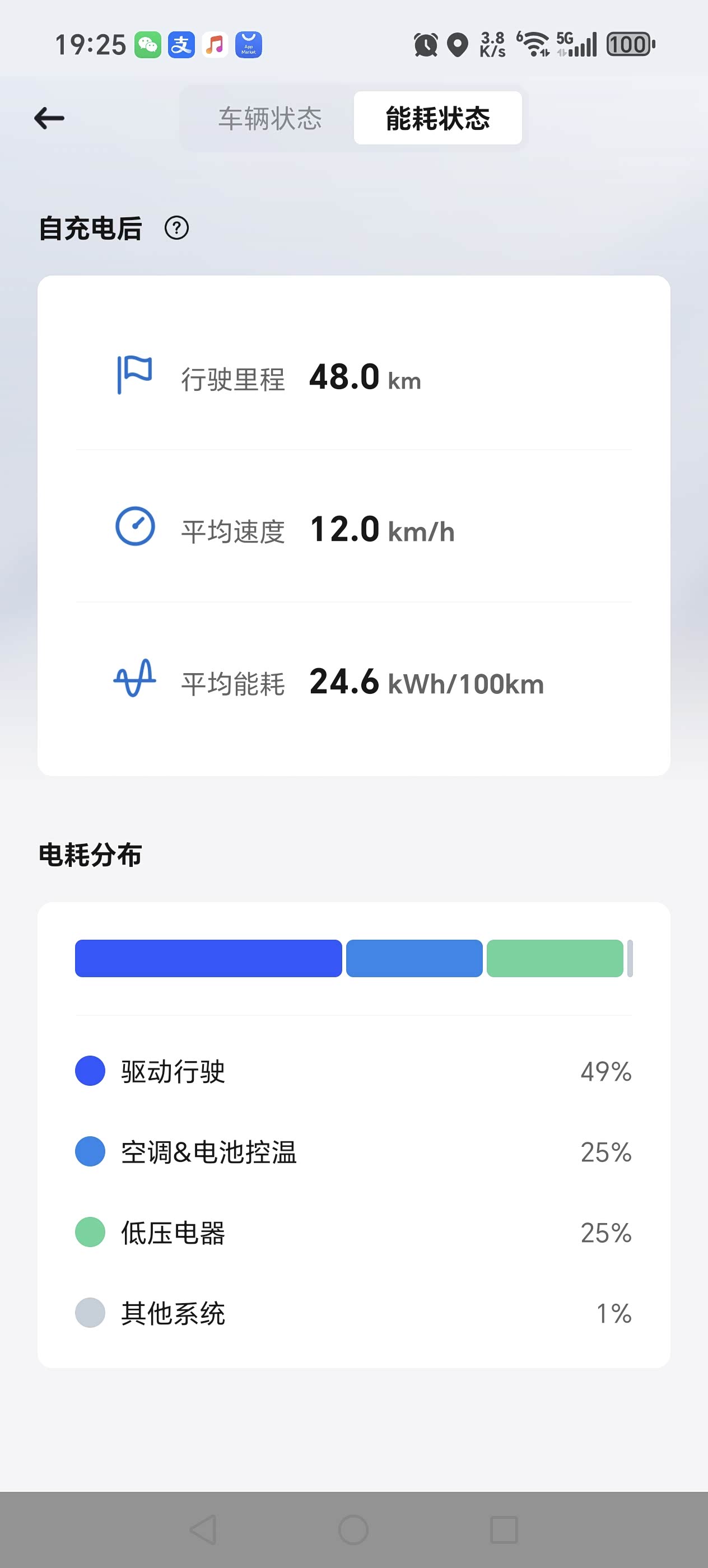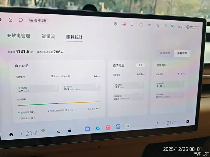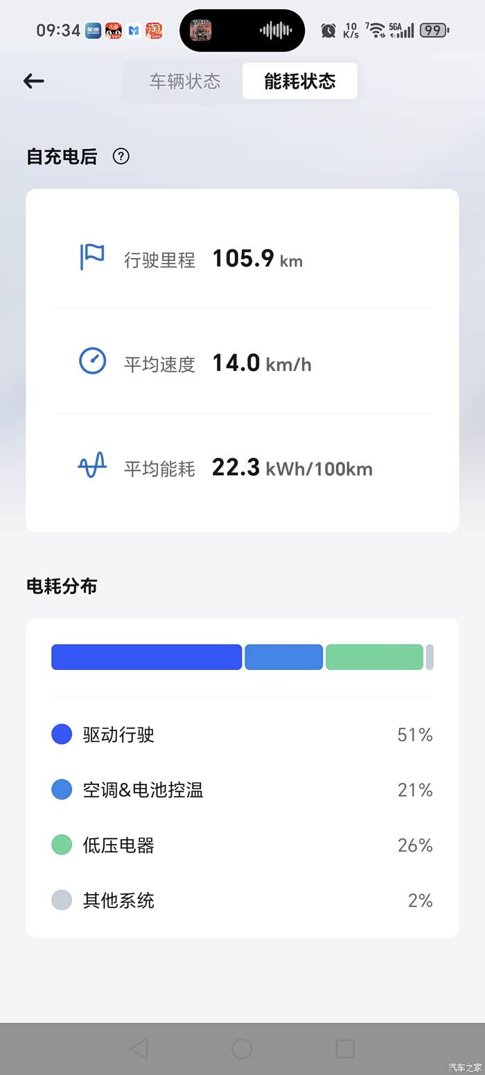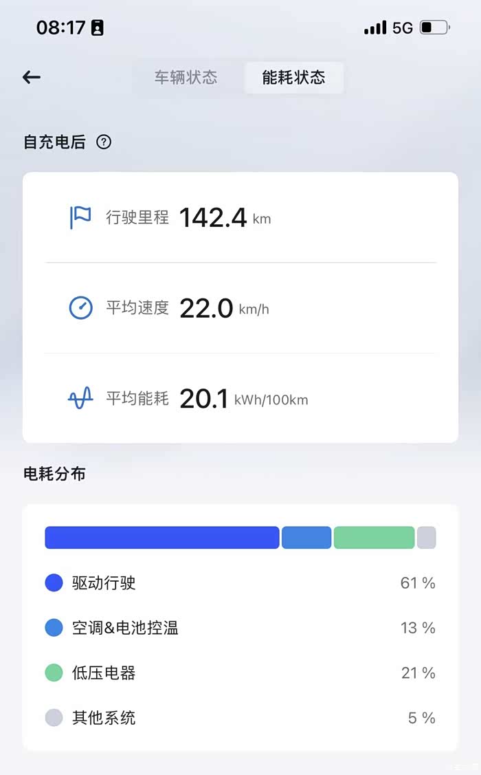 看你的图是空调整猛了;不猛开音响的话,低压电器用电占比主要受车速影响,比如低压电气固定2KW的功耗,行驶1km然后驻车一小时保持ready状态不退出(基本等效以1km/h的速度行驶1km),那低压电器耗电占比可以接近100%。