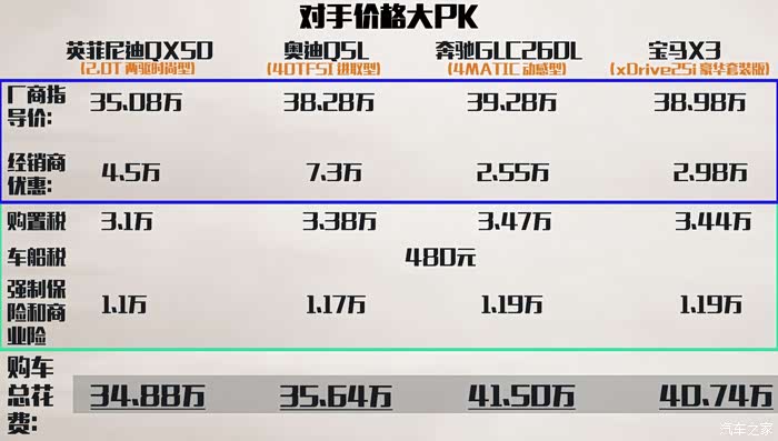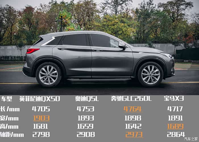 因为我们这次拿到的英菲尼迪的车型是2.0T两驱时尚版车型,是全系的次低配车型,为了让这次对比更加公平准确,剩下的三款车型也是全系里面的最低配或次低配车型。
