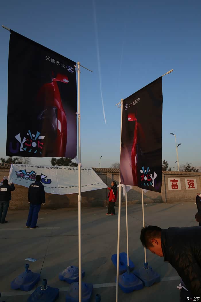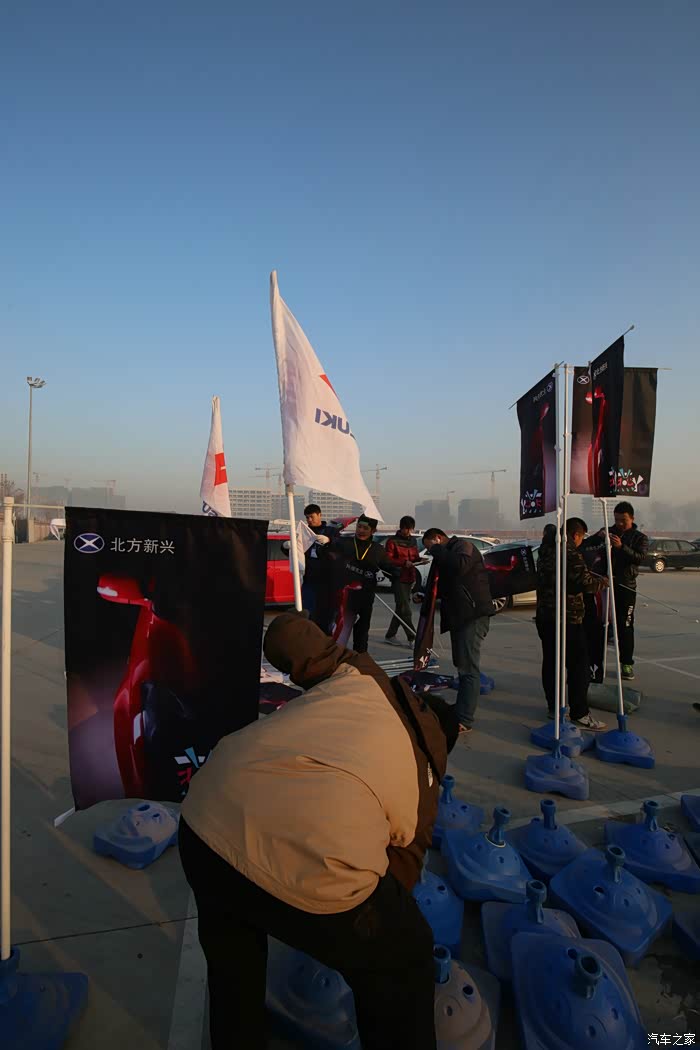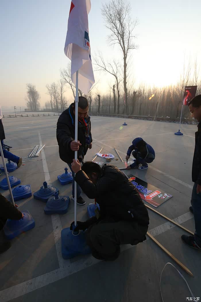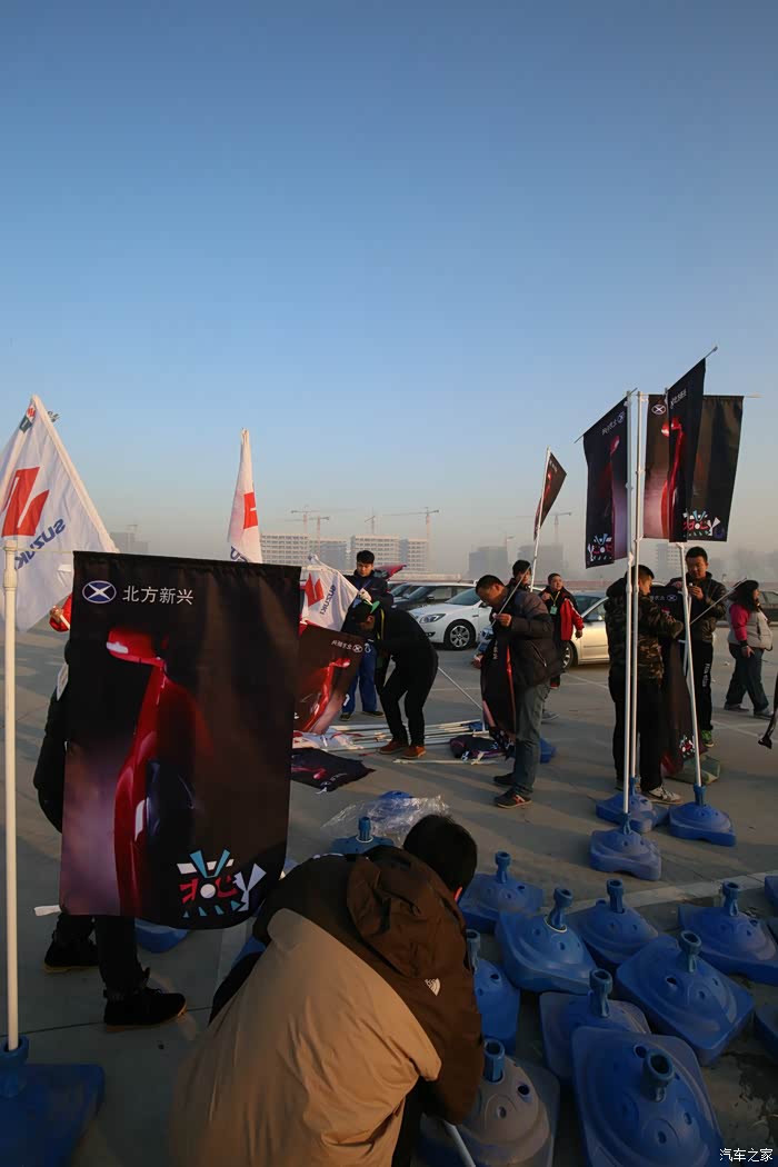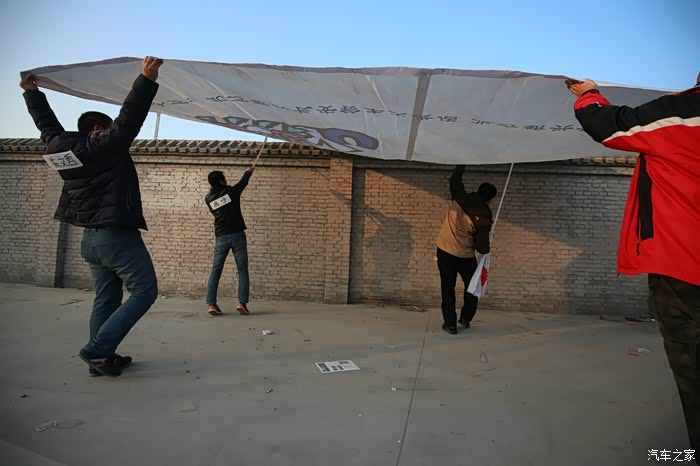 4s店送来背景布和刀旗。提前到场的车友和管理员们共同摆放。