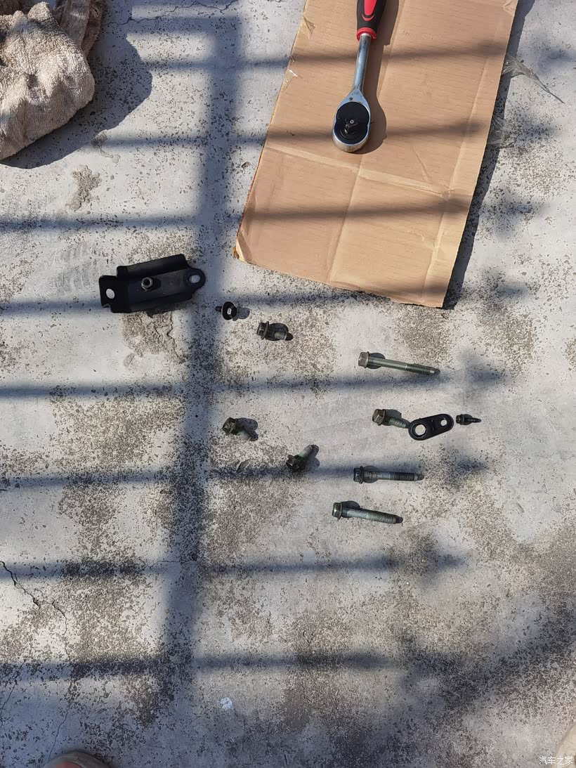 拆了两科螺丝发动机机有点下沉,让旧机脚完全卸力,我用千斤顶加了一点高度撑起来一点。螺丝不是那么紧了,继续拆的