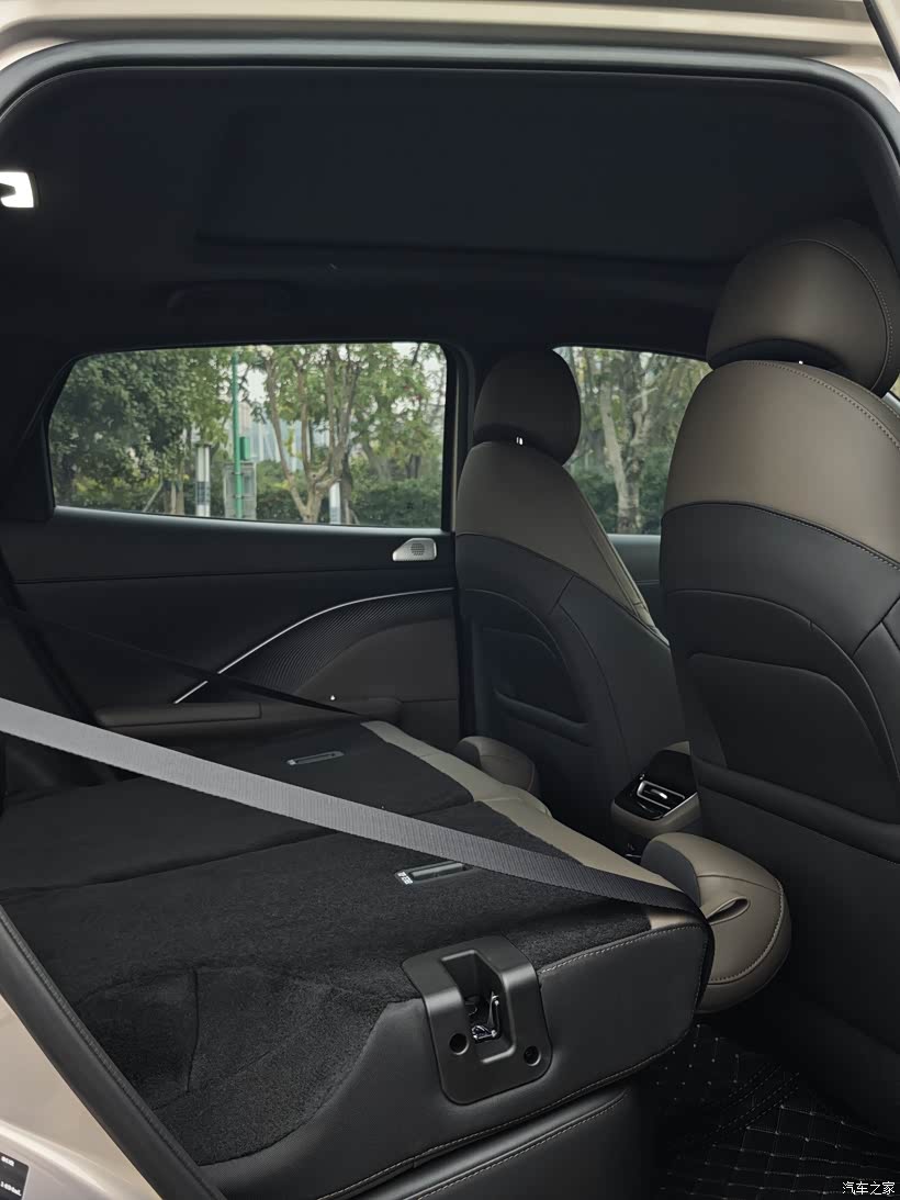 后排空间挺大,能跷二郎腿。后备箱平时家用足够,座椅放倒之后特别平整,拉点大件东西也没问题。车里一些小设计也很贴心,比如副驾有隐藏挂钩,挂奶茶、外卖不怕洒,门板上也能放好几瓶水。