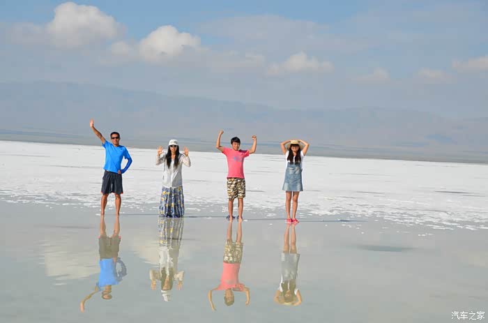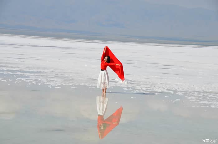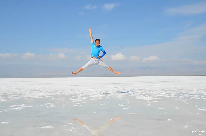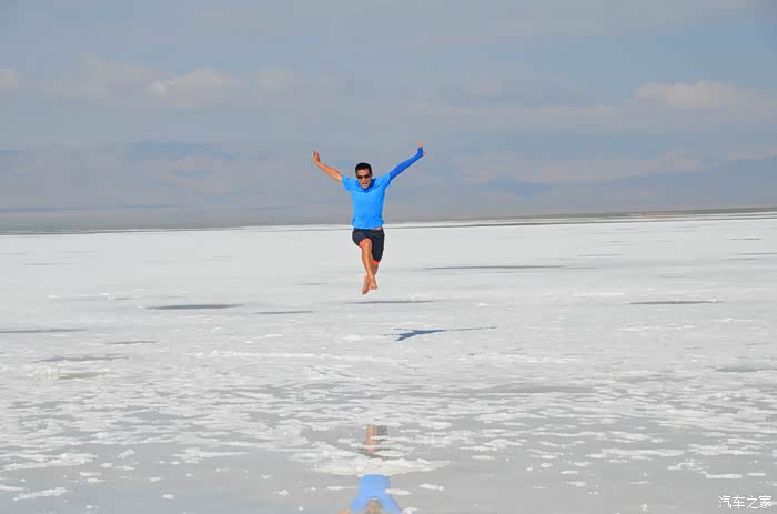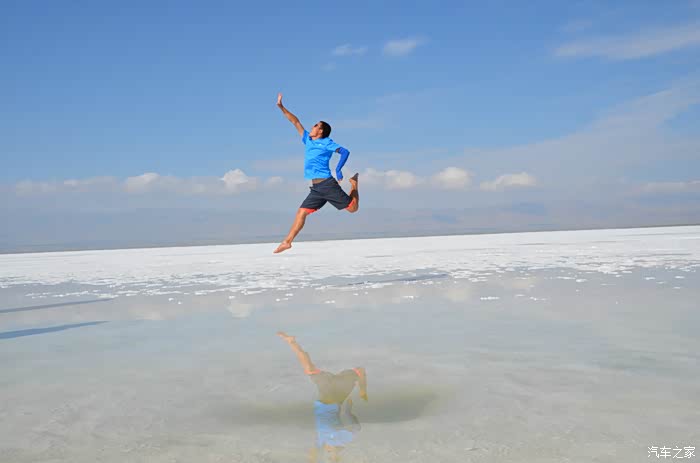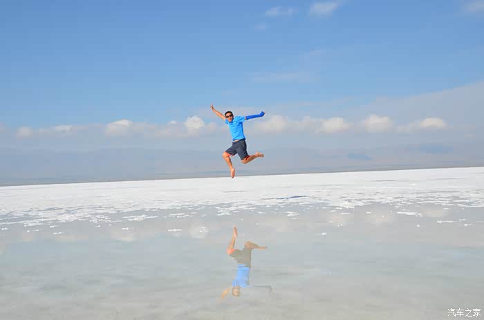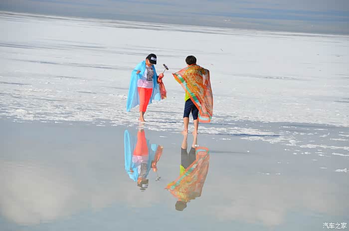 湖面结成白色盐结晶体。人站在上面,如同立于天空的镜子上,水天一线,分不清哪里是天哪里是地