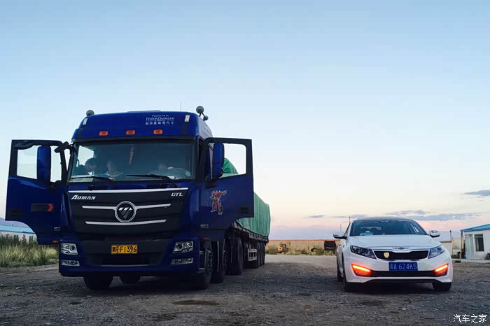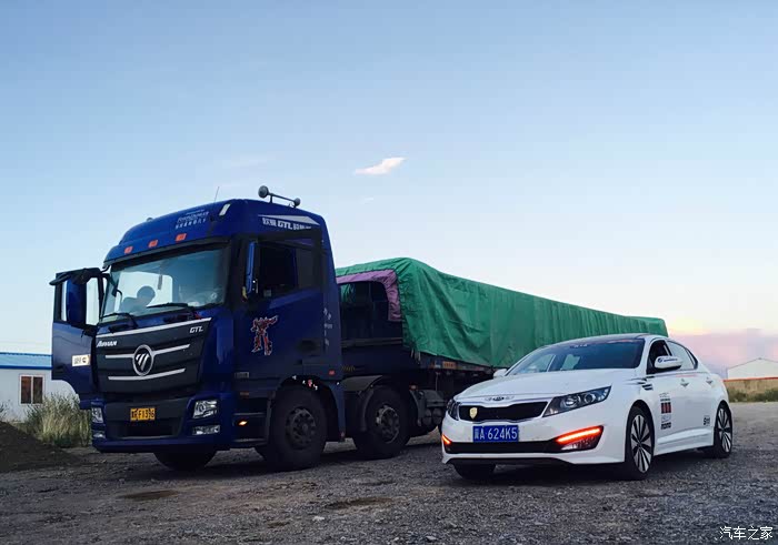 傍晚刮起了7、8级大风,在野外露营有点危险,幸好一位好心的老板收留我们,带我们回他的厂子,这是55吨的戴姆勒,有12个档位,旁边是我们的车,1.5吨,6个档,哈哈