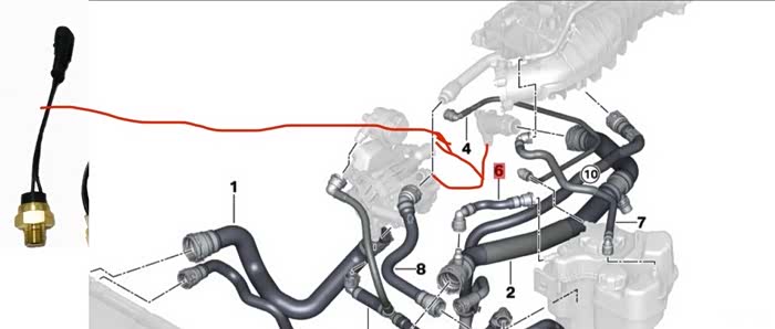 我的改进主要是温控开关的选择和位置上,参照论坛几位车友的方案后,我买了如下图左边的温度传感器,这种温度传感器是铜材料的,应该更精确,恢复稳定差在10度内,截断下图6号水管并把这个传感器塞进去,开启11月到12月的测试。起初自信满满买的90度温控传感器+300欧姆电阻,没成想仪表水温90度时,温控开关没有开启,电阻没有接入,于是买了80度,75度还不行,最后65度的才可以。在11月份,早上室外温度偶有零上几度,65度温度传感器在仪表水温到达85度开启,十二月零下十几度快20度,仪表水温在88度开启。汽车中午再开启,仪表水温40度,说明温控开关已经断开。