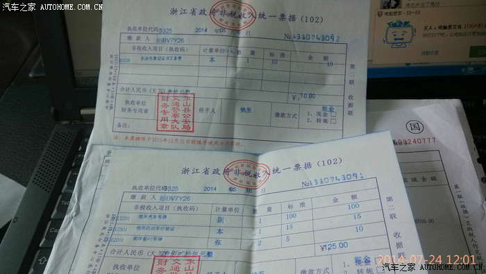 上海的临牌管1个月,交了100元。直到5月16日,看临牌快到期了,恰逢周末天晴,我才带上各种发票证件和资料去了县便民服务中心二楼的国税窗口缴税,一共缴纳了6700元整,还是挺便宜的。接着直奔车管所排队拓号查验车辆一致性,很方便。若你自己去办理上牌手续又不知道怎么办,那么你完全可以嘴巴活络点,叫旁边别家正在帮客户的SSSS人员帮你指点下,我就是这么做的,嘿嘿!~~接下去就是取号,登记,选车牌。号码是随机而来的,很普通,最后上牌总共花费135元,半小时左右就搞定了。车管所人员还提醒我到对面的检测站领取机动车环保标志,不过我后来直接熟不熟路的去了县环保局领取的。若是委托上海四儿子给我上宁波牌照,他们可是出价不菲哦。这该省了。