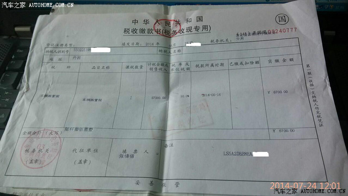 (购置税缴纳了6700元,上牌费用135元)