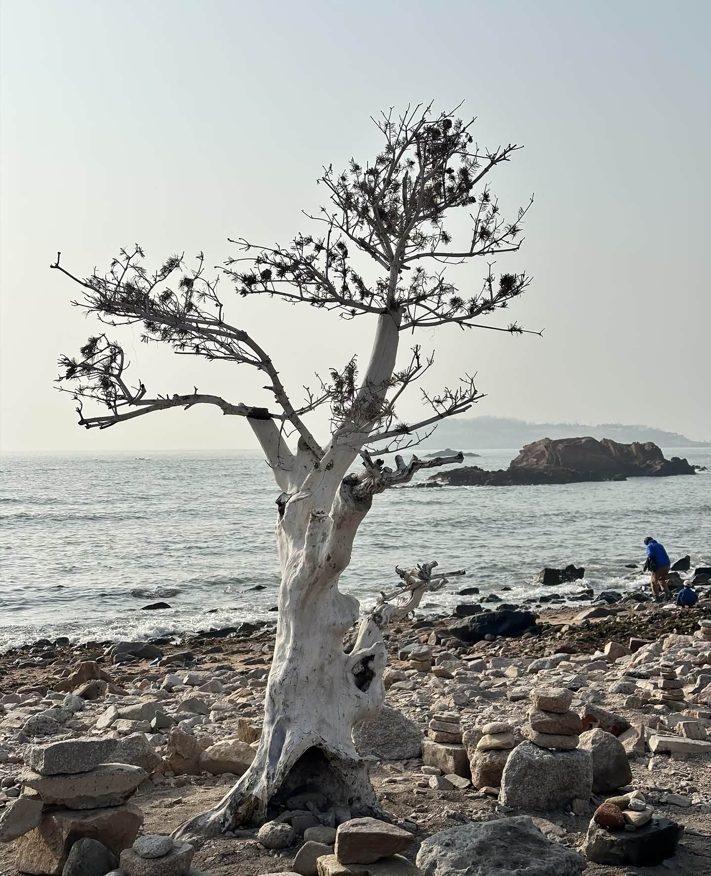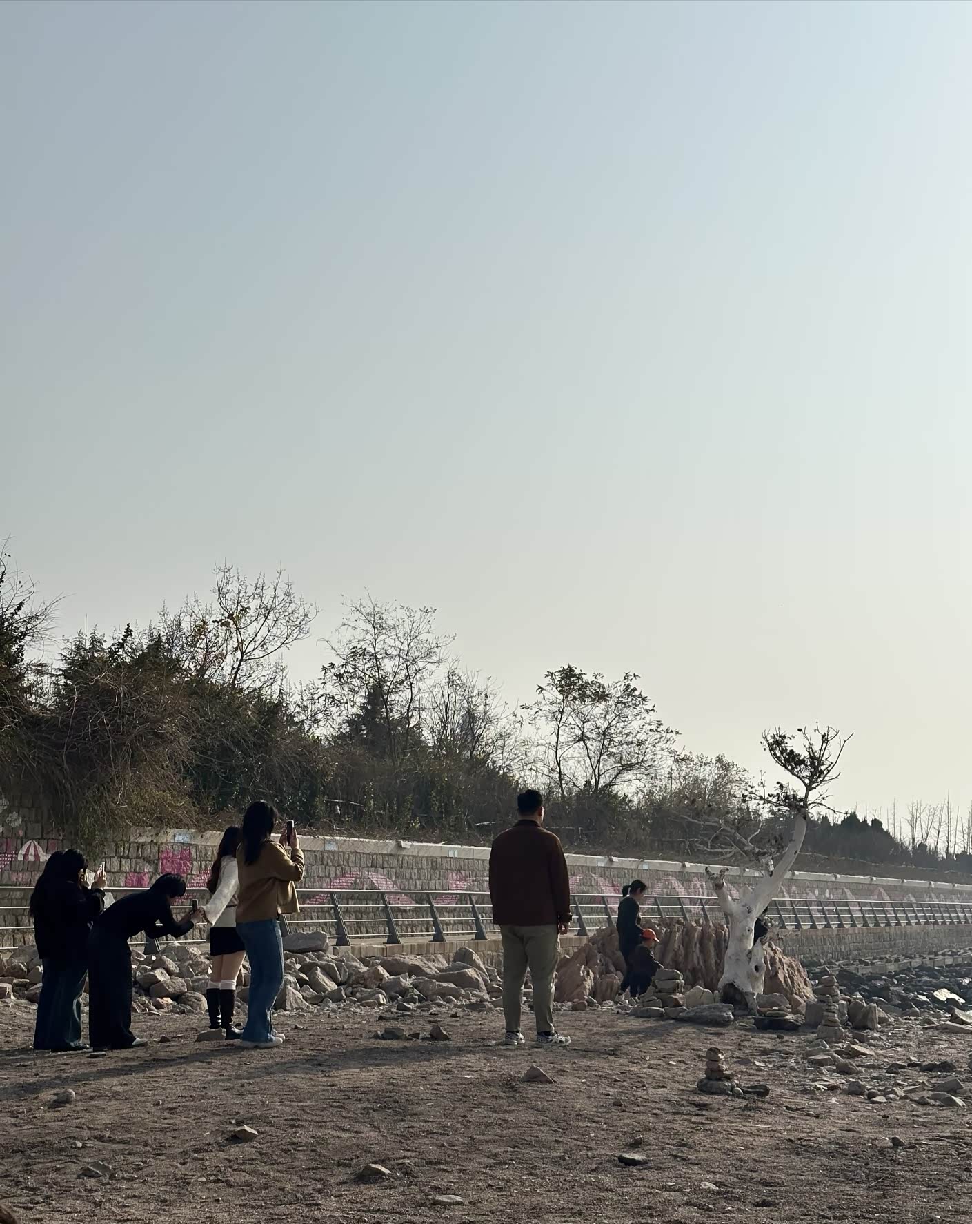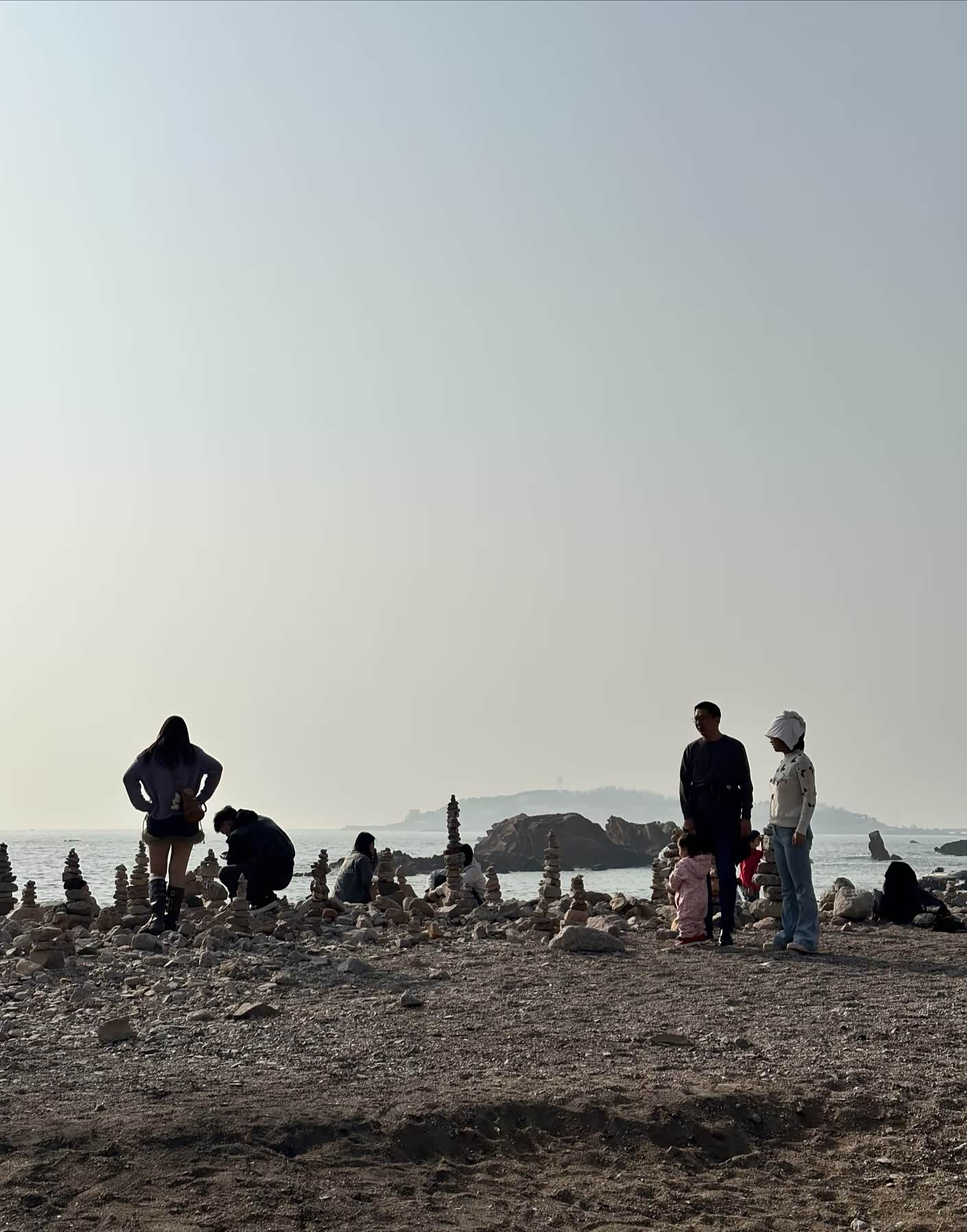 踩着碎石往海边走,礁石上堆着游人搭的石塔,歪歪扭扭却透着可爱。白色枯树孤零零立在滩边,成了大家拍照的背景板,有人举着手机找角度,有人蹲在礁石旁垒石头,海浪拍打着黑石,溅起的水花在阳光下碎成银箔。往远处望,海面上波光粼粼,像撒了一把星星,偶尔有海鸟掠过,给这片静谧的海添了几分灵动。走到木栈道时,恰好撞见一家三口对着海面拍照,夕阳把他们的影子拉得长长的,温柔得不像话。后来又逛到公园的草坪区,这里竟是宠物友好的小天地,各色狗狗撒着欢儿跑,边牧歪着头看主人的样子,惹得周围人笑个不停,冬日的冷清瞬间被这鲜活的热闹冲散了。