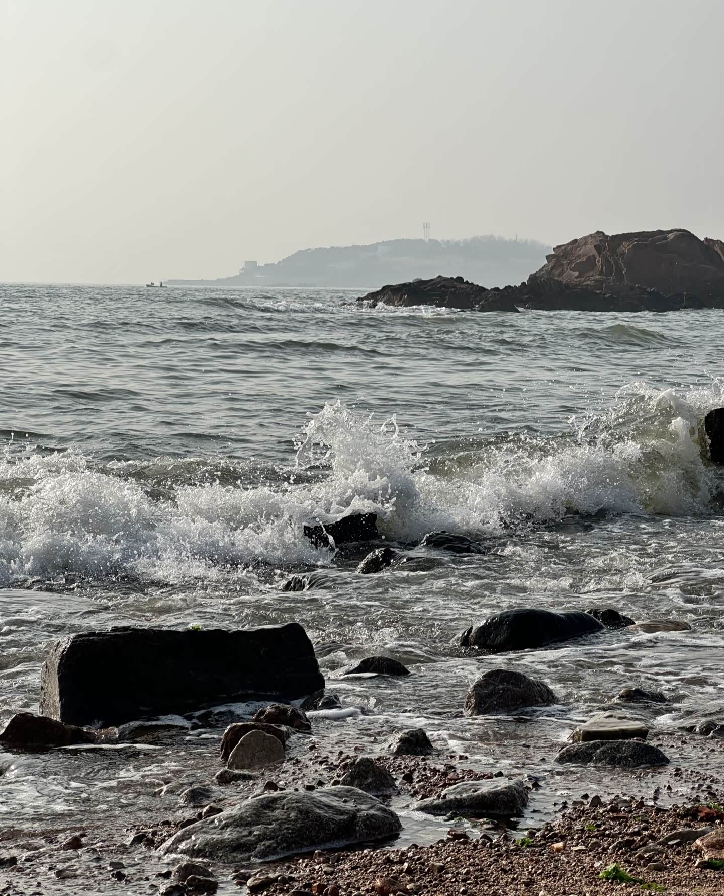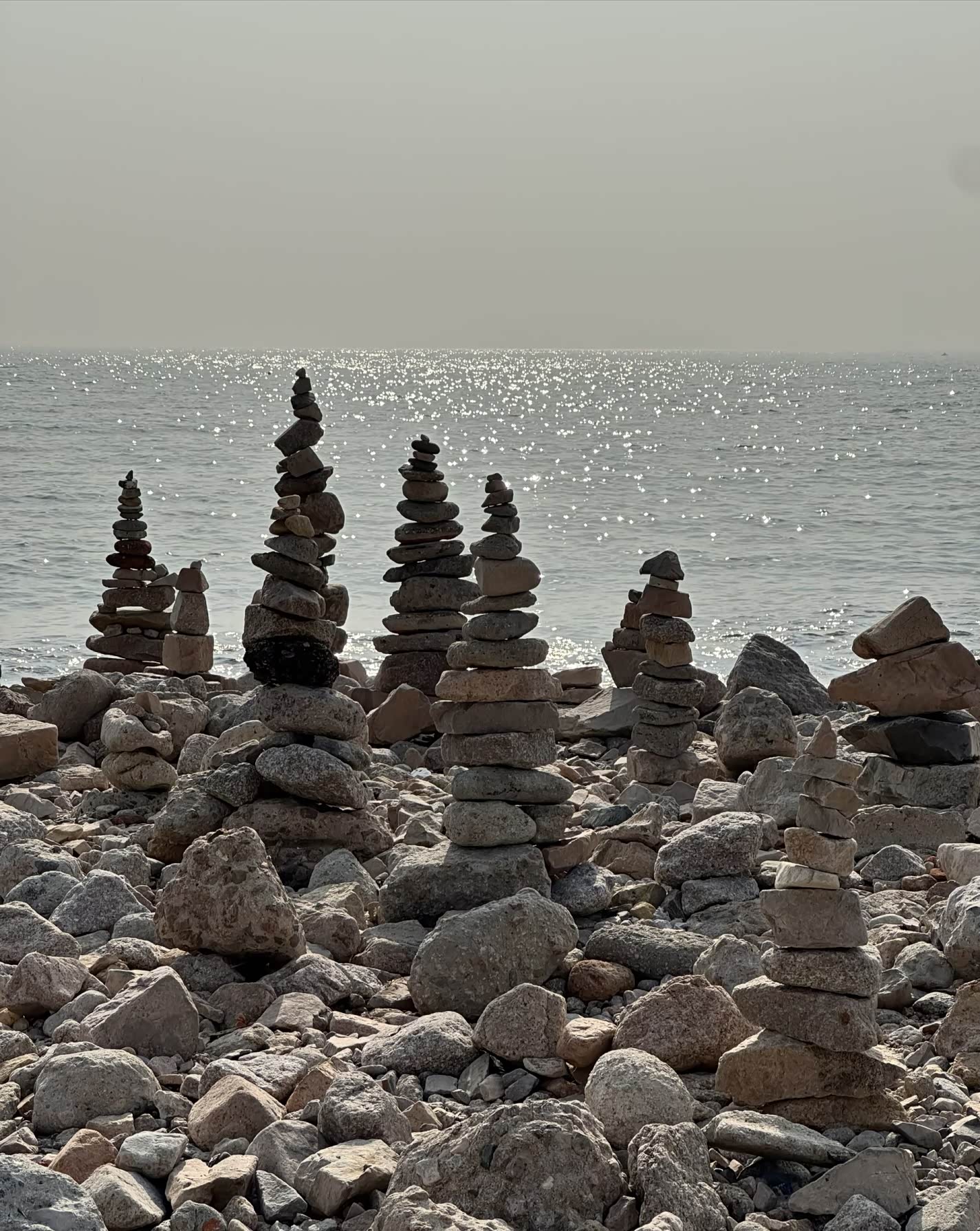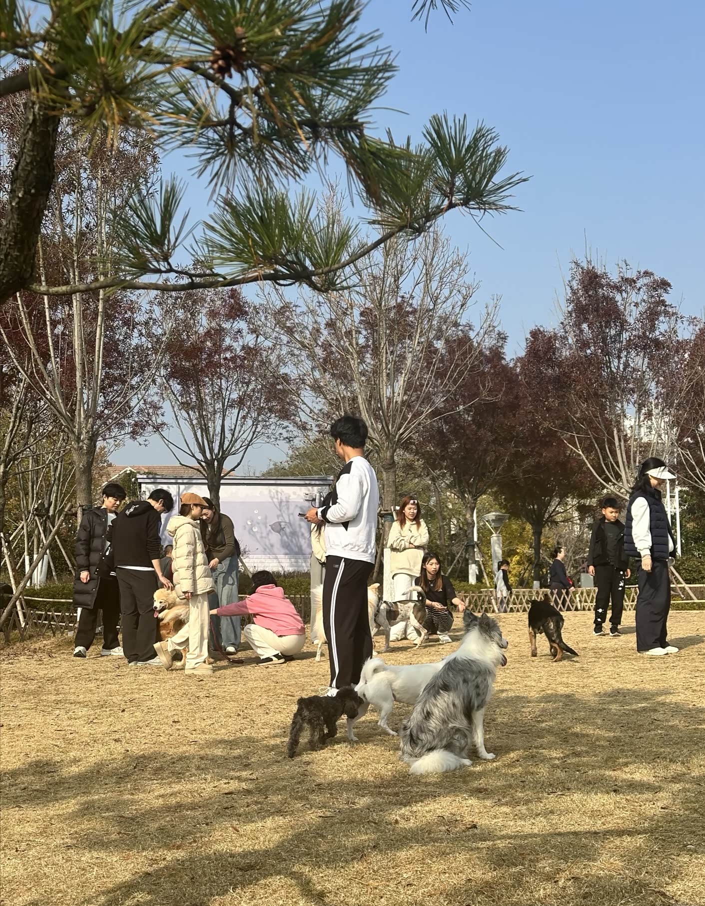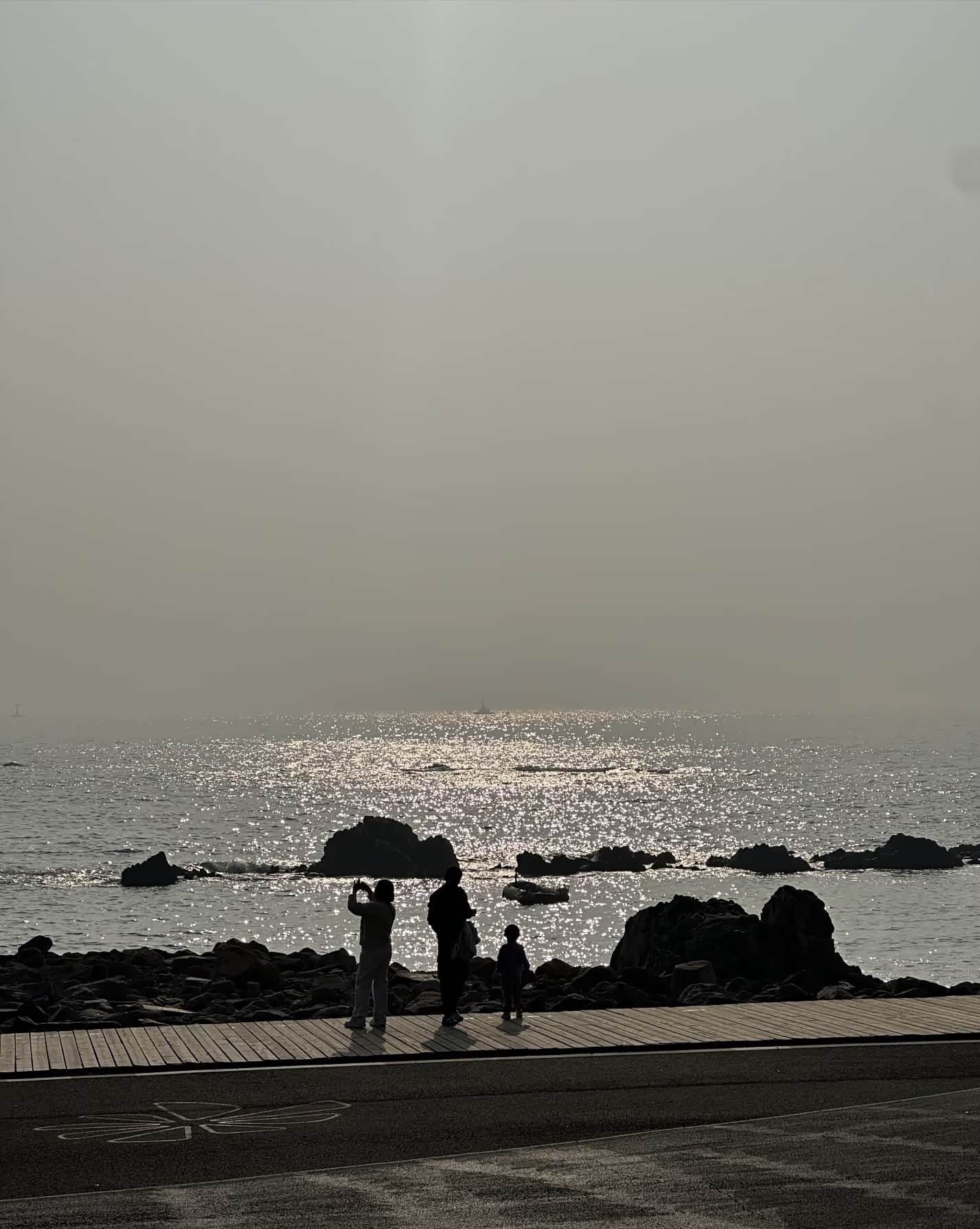 踩着碎石往海边走,礁石上堆着游人搭的石塔,歪歪扭扭却透着可爱。白色枯树孤零零立在滩边,成了大家拍照的背景板,有人举着手机找角度,有人蹲在礁石旁垒石头,海浪拍打着黑石,溅起的水花在阳光下碎成银箔。往远处望,海面上波光粼粼,像撒了一把星星,偶尔有海鸟掠过,给这片静谧的海添了几分灵动。走到木栈道时,恰好撞见一家三口对着海面拍照,夕阳把他们的影子拉得长长的,温柔得不像话。后来又逛到公园的草坪区,这里竟是宠物友好的小天地,各色狗狗撒着欢儿跑,边牧歪着头看主人的样子,惹得周围人笑个不停,冬日的冷清瞬间被这鲜活的热闹冲散了。