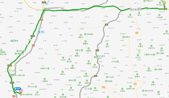 自驾路线的选择是,7月20日从张家口市出发,走G95首都环线高速公路,从丰宁大滩处下高速,在那里玩儿两天,住两晚,然后第三天走国道去草原天路,游玩天路之后从张北回到张家口,结束旅行。大致路线如下图所示。