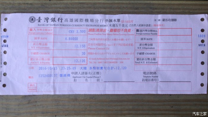 办理完入境手续,我和老婆在机场的台湾银行兑换了2500元人民币,当时的汇率是4.86,2500×4.86=12150元,手续费30台币,到手12120新台币,瞬间成了万元户。