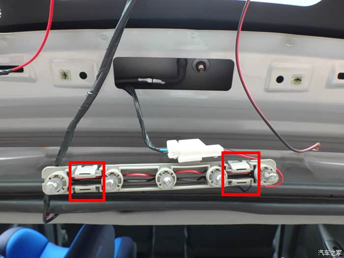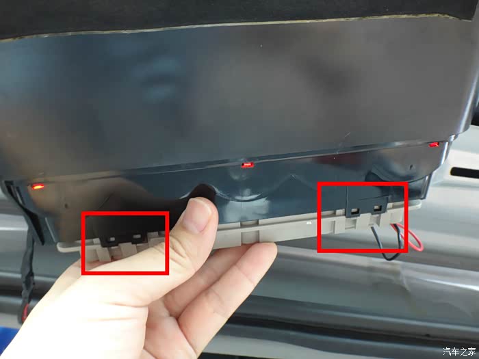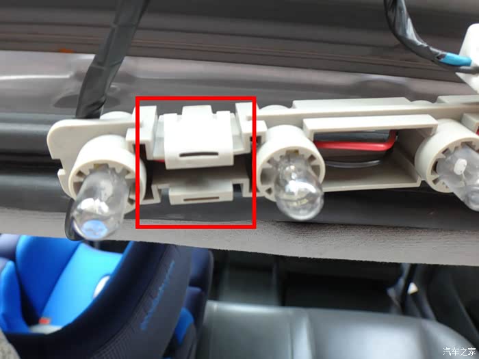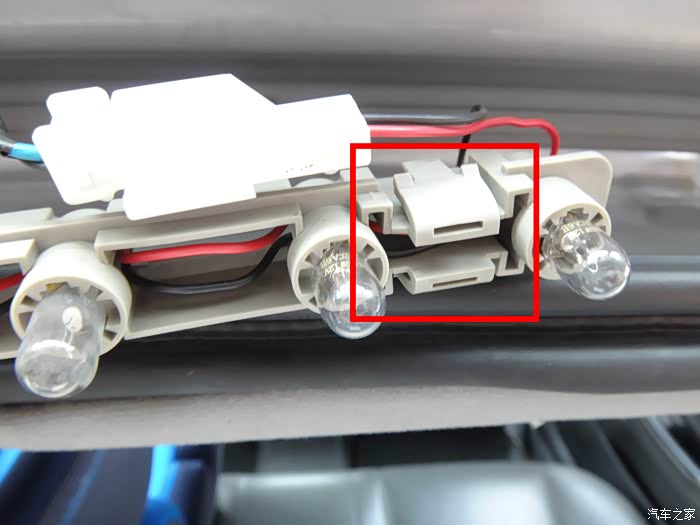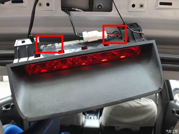 总之,你只需要找到高位刹车灯基座与红色灯罩之间的两处卡扣,然后分别按下去,再稍稍两边用力,就能将灯泡基座和灯罩分离开来。