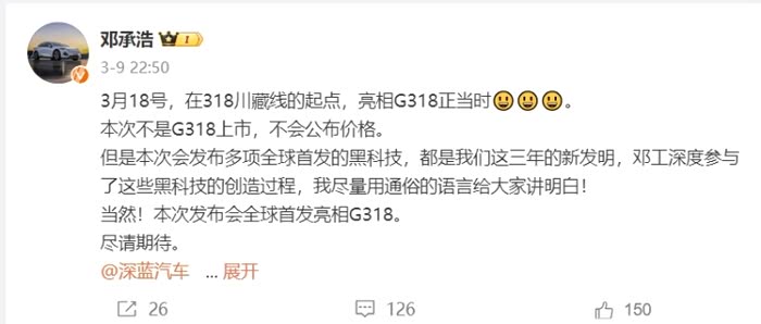 第一个外观体验,除了前脸,侧身、尾部可以给赞,在年轻人群体中应该吃香。第二个空间体验,车身大块头,比豹5大一点,G318的内部可以塞29个行李箱。动第三个深蓝卷技术,技术亮点多,什么无隔膜固态电池、超级增程技术,拿下了几个全球第一。但是吧,这么牛掰的技术全都打包在这台车上,我琢磨着,这价格会不会也跟着“高端”啊?