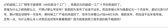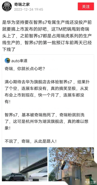 本以为这个争吵也就到此结束了,但是现在争吵愈演愈烈,已经不仅是路人吃瓜了,两家的粉丝各自下场维护正主,华为这边说,去试驾,华为旗舰店里连展车都没有,奇瑞不仅藏私,生产速度还不行,就这点奇瑞这边开始反驳,S7的生产线本来也没有完善,是华为非要强制上线,给M9试水,才导致了现在车上市了,展车也没几辆。看了这个争吵,我总结了一下,最大的受害者其实还是智界S7,真的有种爹不爱,娘不亲的感觉。