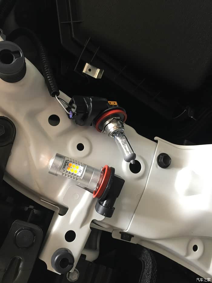 接下来聊聊换雾灯,之前看到论坛里有人说这个雾灯是H11的,我直接去JD买了雪莱特的H11 LED雾灯回来装。发现这个LED雾灯实在不行,搞得跟转向灯似的,而且还不能照亮前方。果断退货。
