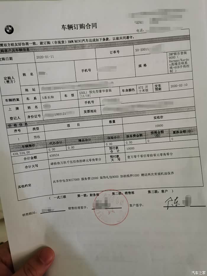 然后第二天就去试新3系,一个月前一个好兄弟刚在这家店提的新3系首发版,我开过,感觉不错,唯一遗憾的就是没有定速巡航,我觉得对我来说定速巡航是刚需,因为经常跑高速跑长途,以后一定整个modleX试试自动驾驶新科技。新3系试驾车一圈开下来,真不错,准备全款定了,但是,没现车,要等,首发版也停产了。我的用车频率太高了,这不能忍,销售跟我说,上5系吧,我说好。试驾530,棒,老婆也说不错,准备买,销售又跟我说530没现车,只有525,又找了辆他同事自己的525给我开了一圈,我感觉动力够用了,160以内应付下来应该不算吃力,那就定嘛,第三天准备去提车,销售跟我说我定的那台525被另外比我先定车的一位车主改选了,他原本定的X3,现在改成525,没办法只能优先给他了。我老婆准备发飙了,我脾气好,赶紧按下,告知老婆,没事没事,我会解决。正当我准备去另一个城市的4S店的时候,销售跟我说,现在有一台530现车,是他们同事定了的,考虑到我急需用车,就让出来给我。哈哈哈,我怀疑是套路,但没事,反正都要买,别把心情弄不好了。最后就买这台530Li开士米银乞丐版。