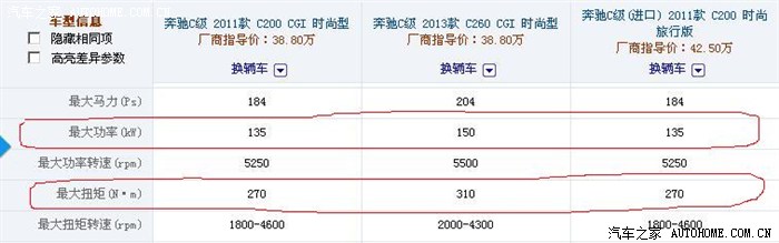 接下来的两张是汽车之家官方公布的C200、C200旅行、C260三款车的相关数据及老狼的C200旅行安装VATH外挂后在HAMA四驱马力机上的测试数据结果
