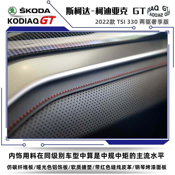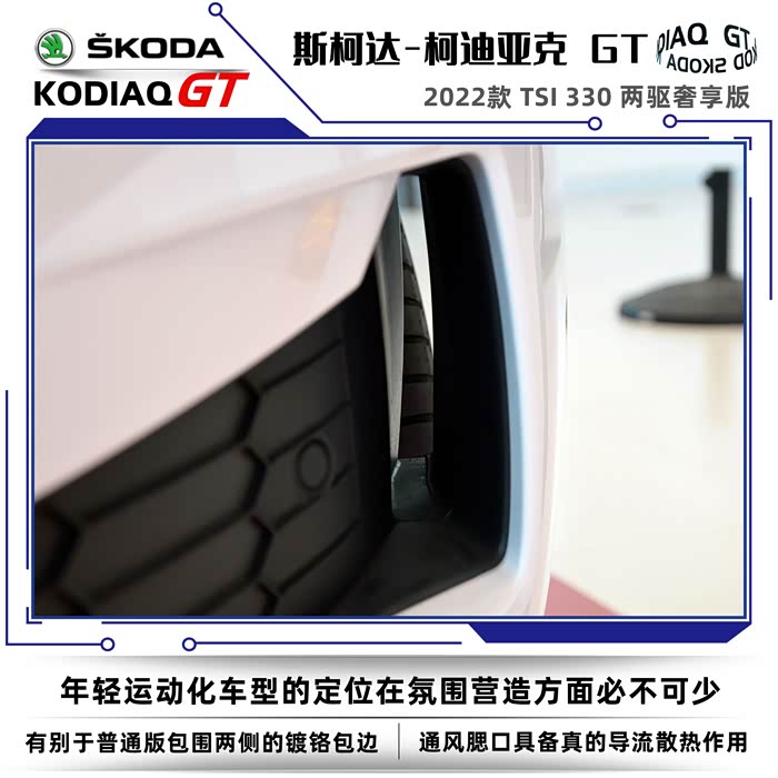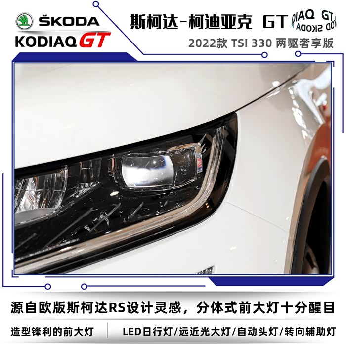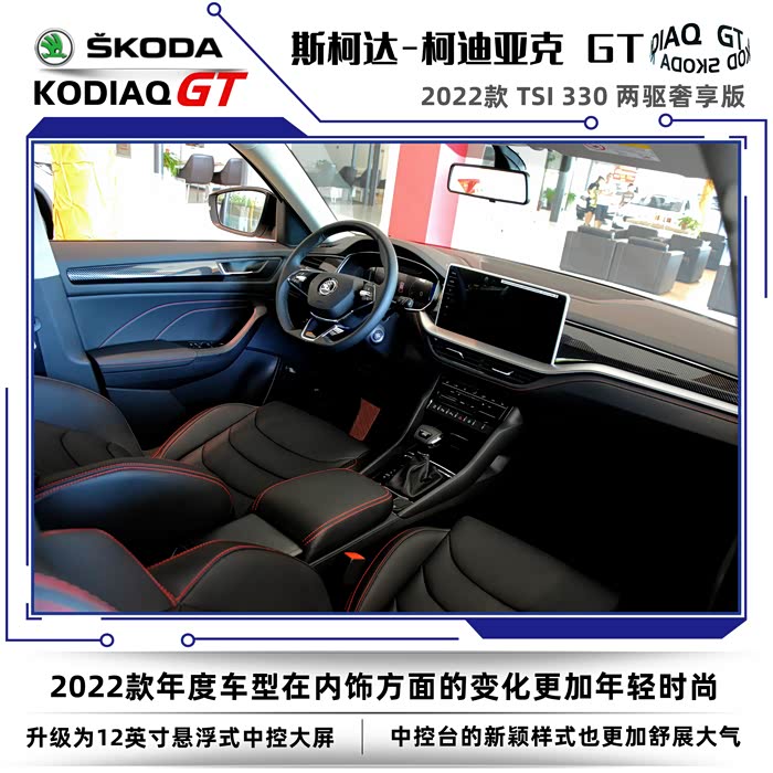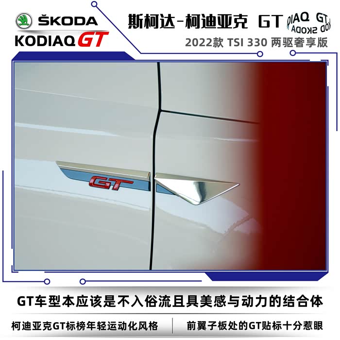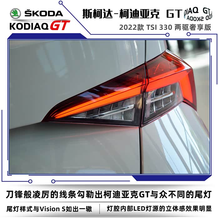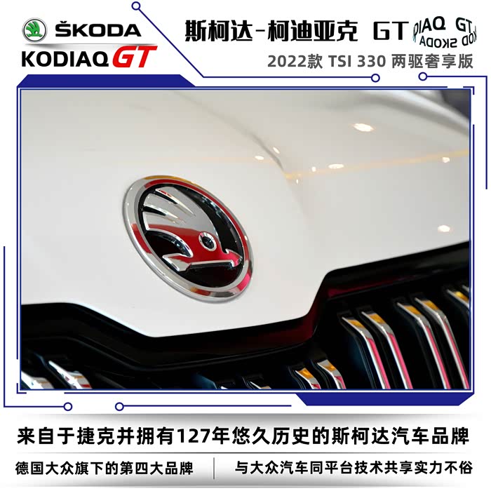 2022款斯柯达柯迪亚克同样分为普通版和GT车型,我这次到店看车的车型是柯迪亚克GT2022款 TSI330 两驱奢享版。没有不同配置的细致划分,选择起来也很简单,2022款的GT车型只有两款,两驱奢享版和四驱旗舰版。GT英文全称是Grand Tourer,可以称之为豪华旅行车的意思,再后来只要是冠以GT名号的车型基本上都是性能优异、发动机马力强劲的高性能跑车。在车名尾缀上加GT需要的不仅是勇气,还得有强悍的实力,不然的话名不副实反而会落个哗众取宠之嫌。