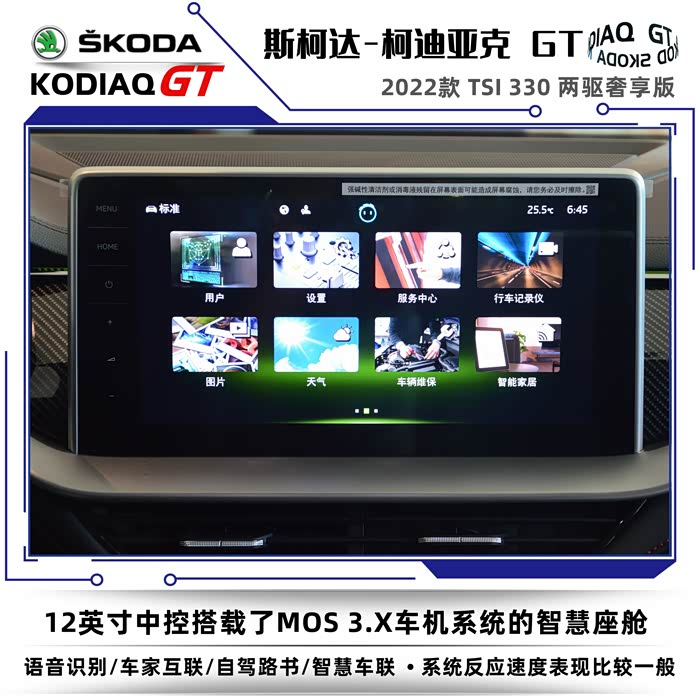 2022款柯迪亚克GT在车内变化比较大,中控台的造型画风一变,一下子简约年轻了不少。线条更加舒展流畅,悬浮式中控大屏成为最大的亮点,屏幕升级到了12英寸,也算是与时俱进了。搭载的MOS 3.X智慧车联系统也是年度改款的重点之一,这套车机系统优缺点分明,首先是UI画面设计的有些山寨感,每一个图标与红黑色背景形成较大反差,显得挺突兀的,缺乏高级感。还有就是整个系统的反应速度不够快,总会有一定的迟滞时间,语音指令也有同样的问题,并不能让人满意。优点是这套车机系统不仅具备智能网联,还提供CarPlay和CarLife这样的映射功能。还有就是系统的操作逻辑具有良好的易用性,没有让人不适应的复杂多级菜单,使用的流畅不还是蛮不错的。