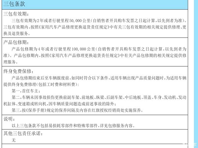 车辆必须是首任车主,必须要按照保养手册上的时间进行保养,所保养的地点是红旗授权的经销商,车辆还不能够更换一些配件,其中包括前副车架,纵梁,中后地板,车身,发动机,发动机缸体,变速箱,转向机,后副车架,顶盖等由于车辆质量的问题所造成的前述事故的除外。