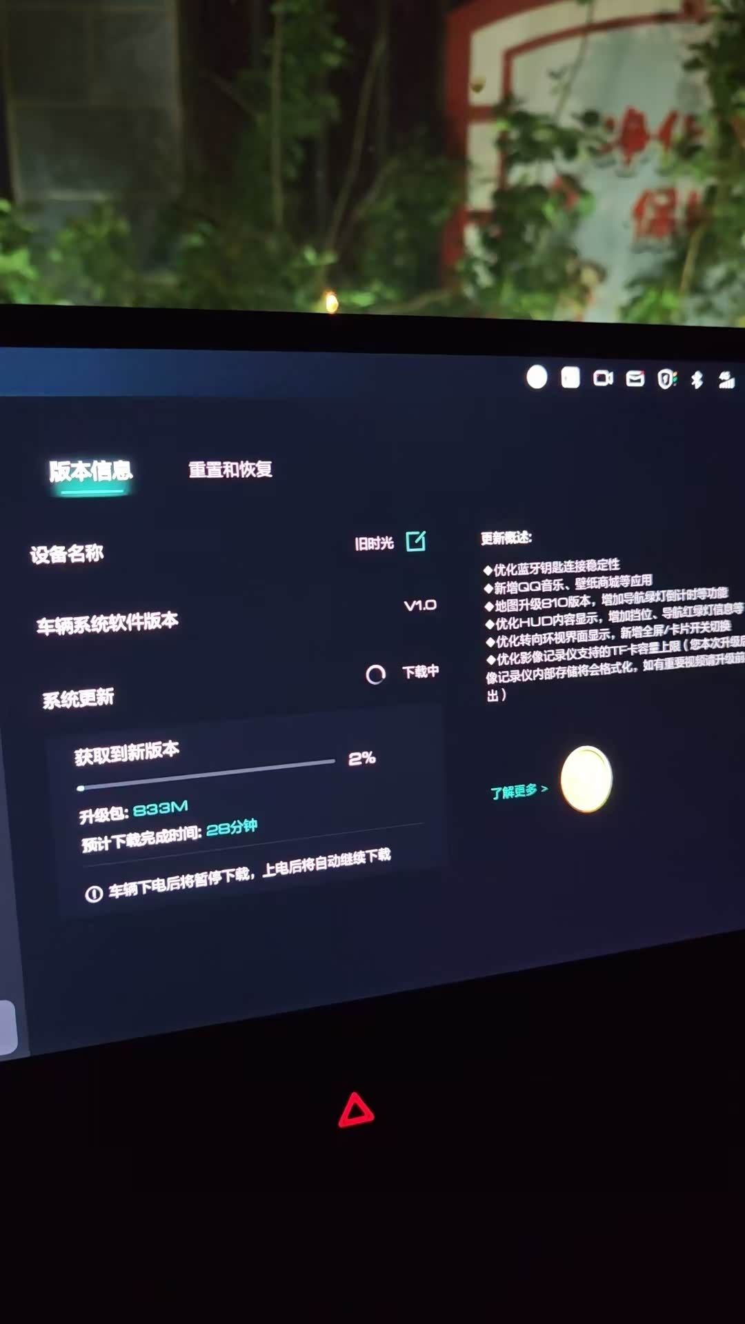 HUD抬头显示感觉挺方便的。车速、导航这些简单的信息直接显示在前挡风玻璃上,看的时候眼睛不用离开路面太多,稍微往下瞄一眼就能看到,尤其是跑高速或者找路的时候,省得老低头看仪表盘,能更集中精神看前面。前天收到车机升级的推送,就顺手升了,这里要提醒车友电量要保持在百分之七十以上停车通电就可以升级也可以预约升级,比如抬头显示就升级档位和红绿灯读秒功能,增加了QQ音乐最明显的变化就是多了个更换壁纸的功能。以前那个界面看久了确实有点单调,现在能自己换张图,感觉新鲜了一点,挺好~这车开久了,感觉越来越顺手了,家用车,就该是这个样子!