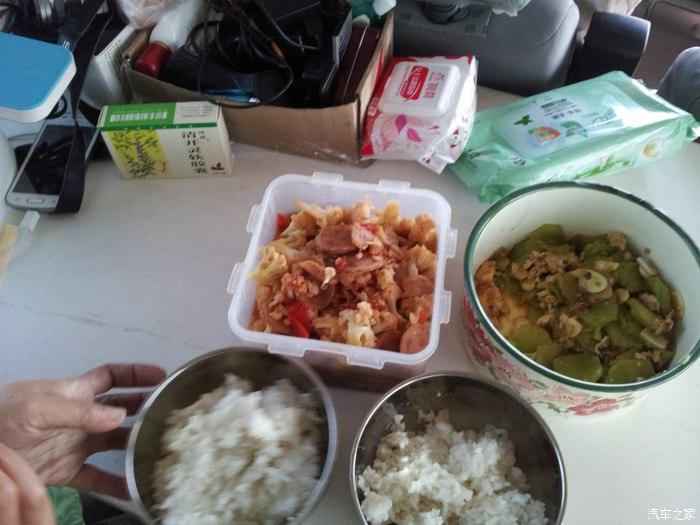 出发时买的菜多了点吃了那么多天都没吃晚,好在车上有冰箱。省钱啊!