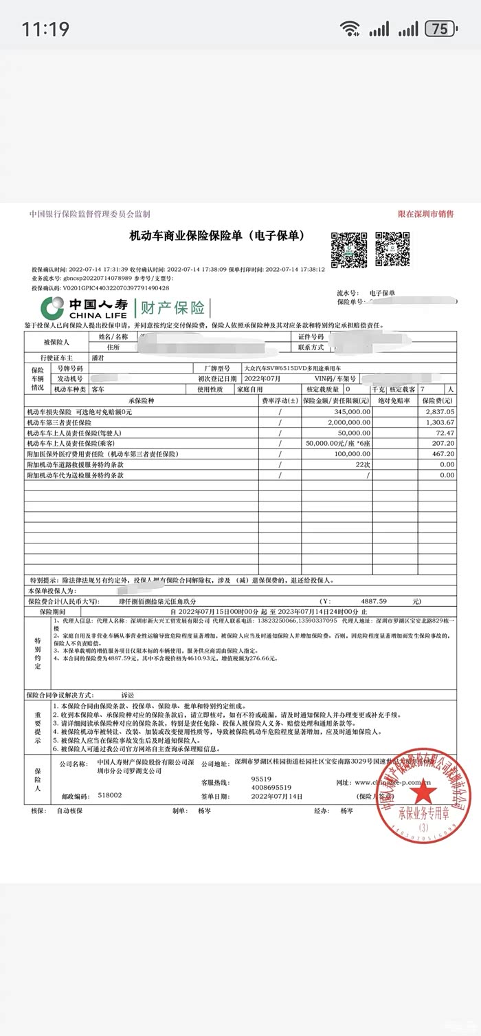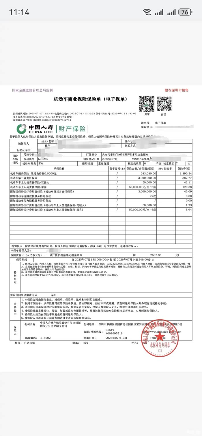 2022年7月首年商业险保费4887.59元,当时新车落地,选了车损险(保额34.5万)、200万三者险、驾乘险和医保外医疗费用责任险,保障拉满;2023年7月第二年商业险降到3835.77元,三者险直接升级到300万,车损险保额随车辆折旧降到29.04万,保费却少了1000多元;2024年6月第三年商业险进一步降到2892.41元,车损险保额26.53万,300万三者险依旧保留;2025年7月第四年商业险已降至2587.86元,车损险保额24.3万,保障内容不变,保费再降300多元。