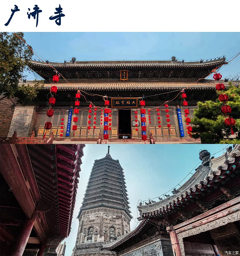 广济寺塔坐落在广济寺南,原名八方镇餮浮图——无垢净光舍利塔,也称白塔、舍利塔,是辽代辽道宗清宁三年(1057年)为尊藏其母仁懿皇后肖挞里所天降之感应舍利而建的舍利塔。广济寺塔为八角十三层密檐式实心砖塔,原高63米,现存高度为57米,经过1996年的全面维修后,塔高达到71.25米。