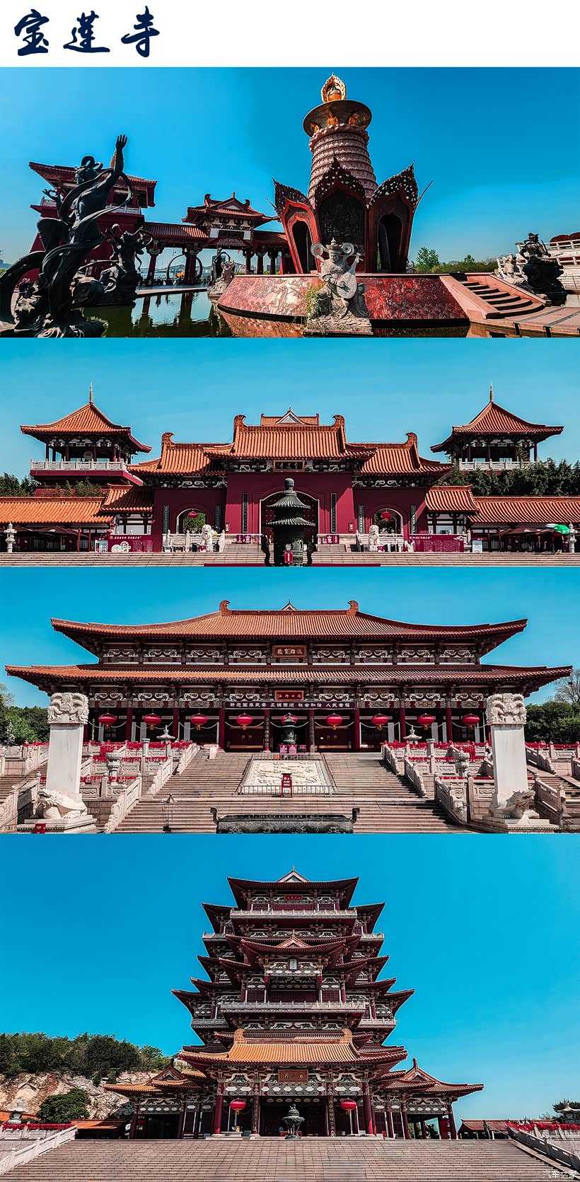 建筑群中,七佛殿是国内最大的大雄宝殿,殿内藏有长37.5米高9.5米的南海拜观音壁画,是国内单体面积最大的佛教题材壁画,七佛是指毗婆尸佛、尸弃佛、毗舍婆佛、拘楼孙佛、拘那含佛、迦叶佛、释迦牟尼佛。通天阁高59.88米,是国内最高的佛阁,供奉着弥勒菩萨真身---天冠弥勒;佛像高39.88米,也是国内最大的室内锻铜佛像。