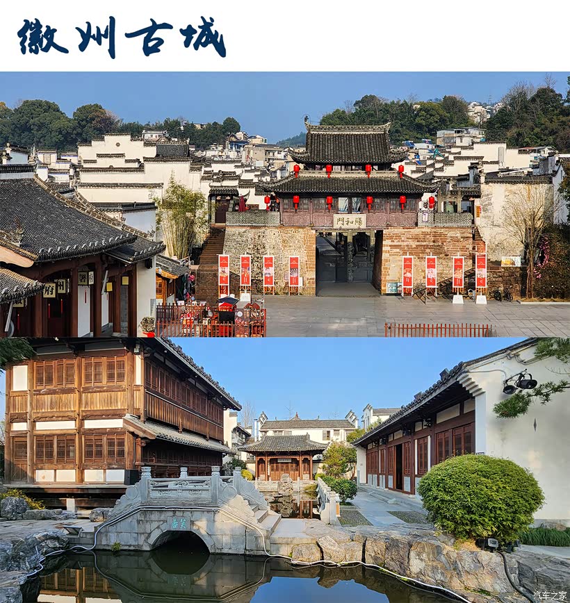 徽州古城分内城、外廓,有东西南北4个门,此外还保留着瓮城、城门、古街、古巷等。城内主要景点有徽园、渔梁坝、许国石坊、斗山街、陶行知纪念馆、新安碑园、太白楼等。
