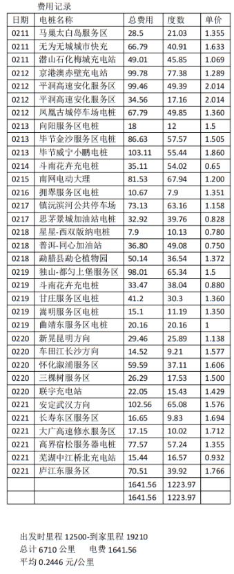 总的来说这次横跨5个省份 从江苏到安徽 到湖南 贵州 云南的旅程还是满意的。从中国的最东面横跨大半个中国到达最西南。基本上零跑C11没有出现啥幺蛾子。出发的时候汽车是12500公里,到家是19210公里。总计6710公里。充电1224度电,电费1641元。感谢发达的扫码支付可以让我吧费用明细都可以列出来