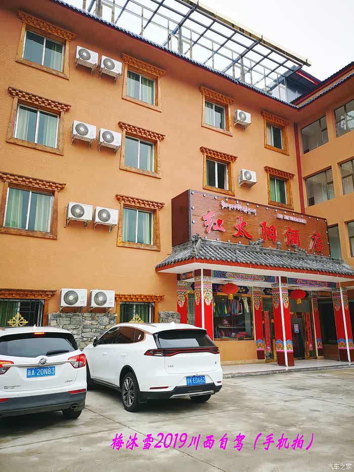 这是我们入住的酒店,红太阳酒店,100元一晚,很便宜,门前停车地方大